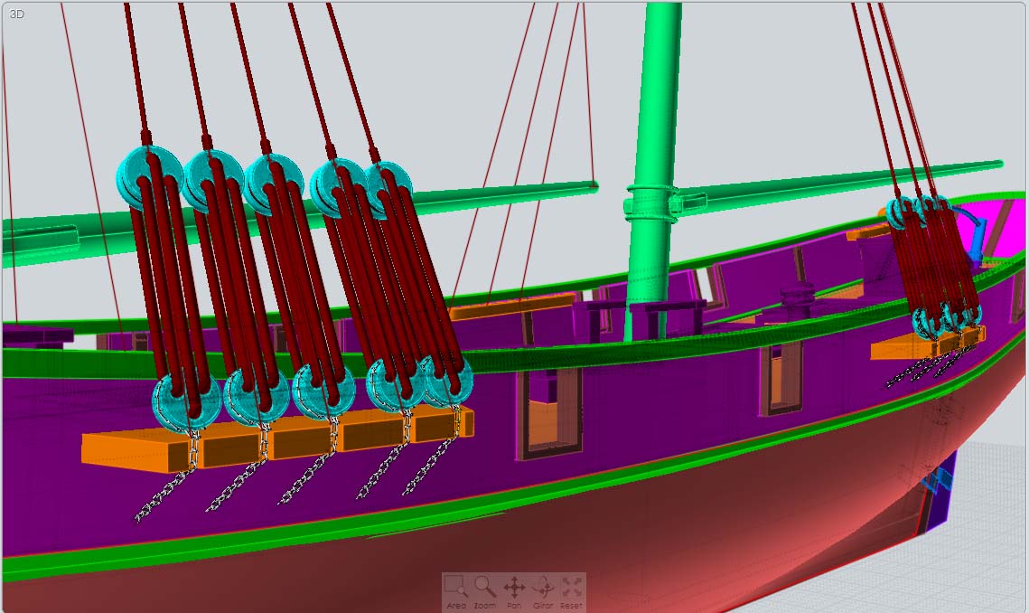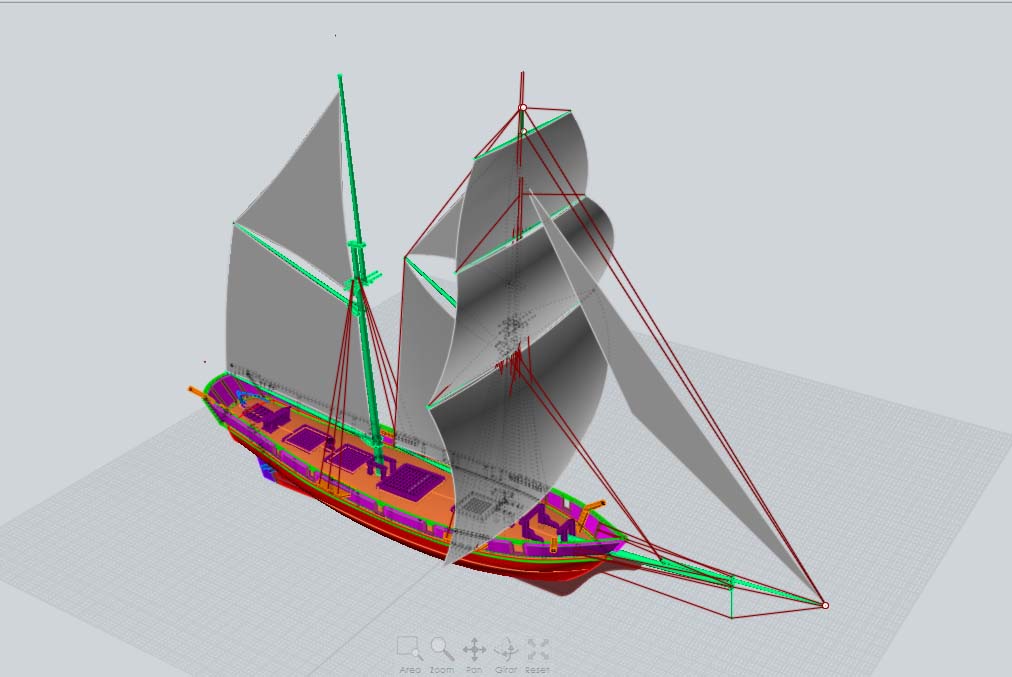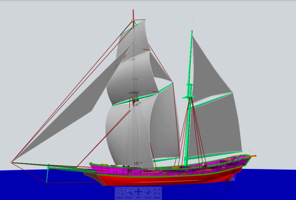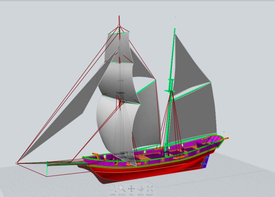 Vaya, hombre, no es un galeón como el tuyo, así que, lleva alguna cuerda de menos. Lo que pasa es que estoy pensando en complicarme la vida, después de ver éste vídeo, (como dice el autor, a partir del minuto 7:15 se ve cómo están hechas las animaciones).