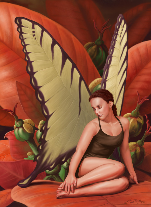 Está muy chula la imagen, te digo un par de cosas que veo, queda un poco raro el contacto de las piernas con la hoja, parece que estén superpuestas, una sombra de contacto le daría más consistencia (vamos, un pase de AO). También veo que la imagen tiene un enfoque muy general, quizás quedaría bien separar el personaje del fondo (desenfocándolo gradualmente). La paleta la veo un poco uniforme, molaría centrar la atención al personaje con algún cambio de color, y quizás forzar un poco más la iluminación y unos brillos para definir el contorno personaje haría que ganara el conjunto, no sé.