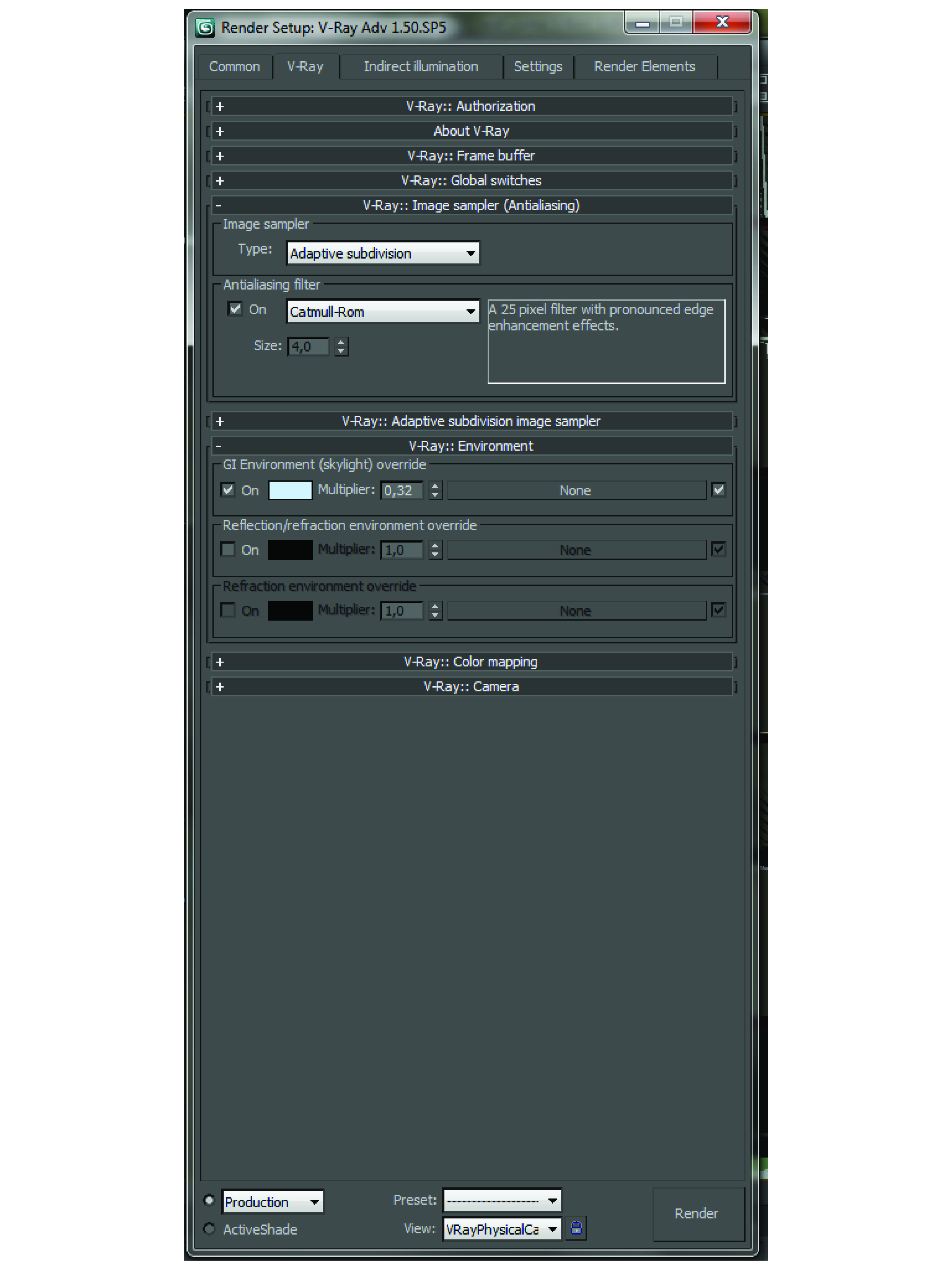 Saludos cordiales. Estoy intentando realizar un render ya con Vray Sun y Vray Sky (como me recomendaban en mis anteriores post) ya que, con las configuraciones que utilizaba antes (dayligth + Mental Ray Sky) no se producuía el efecto realista de luces y sombras que tanto nos gusta del 3ds Max, sin embargo, ahora el problema que tengo es que las partes oscuras de la composición se pierden y casi no se ve nada. Adjunto la imagen del render como me está quedando, así como también los parámetros utilizados nen Vray. Gracias de antemano.