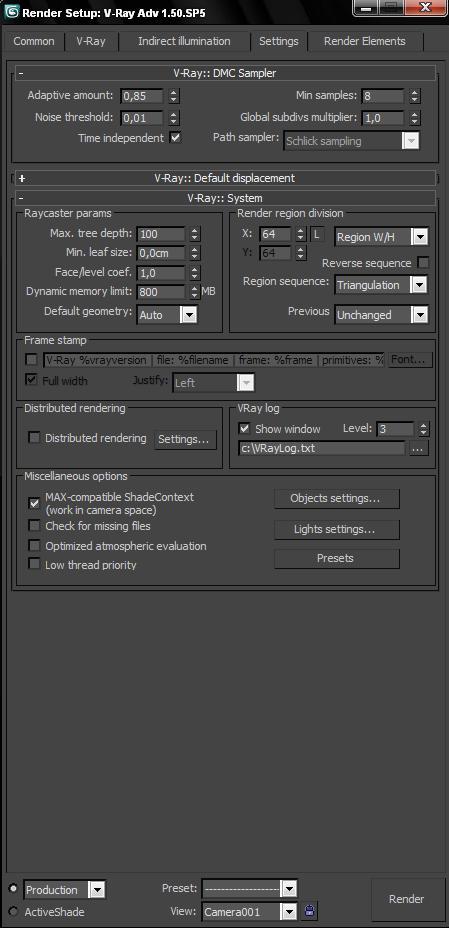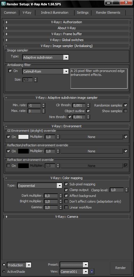 Buenas, yo desde mi humilde y novato punto de vista, los setting que usas los veo bien, vamos son los mismos que uso yo casi siempre, escepcto el dark multiplier del Color Mapping que lo veo muy alto, yo uso normalmente un 1,5 a 1,8 en interiores (eso sí, modificando el gamma a 2,2), pero por lo demás es más o menos lo mismo.