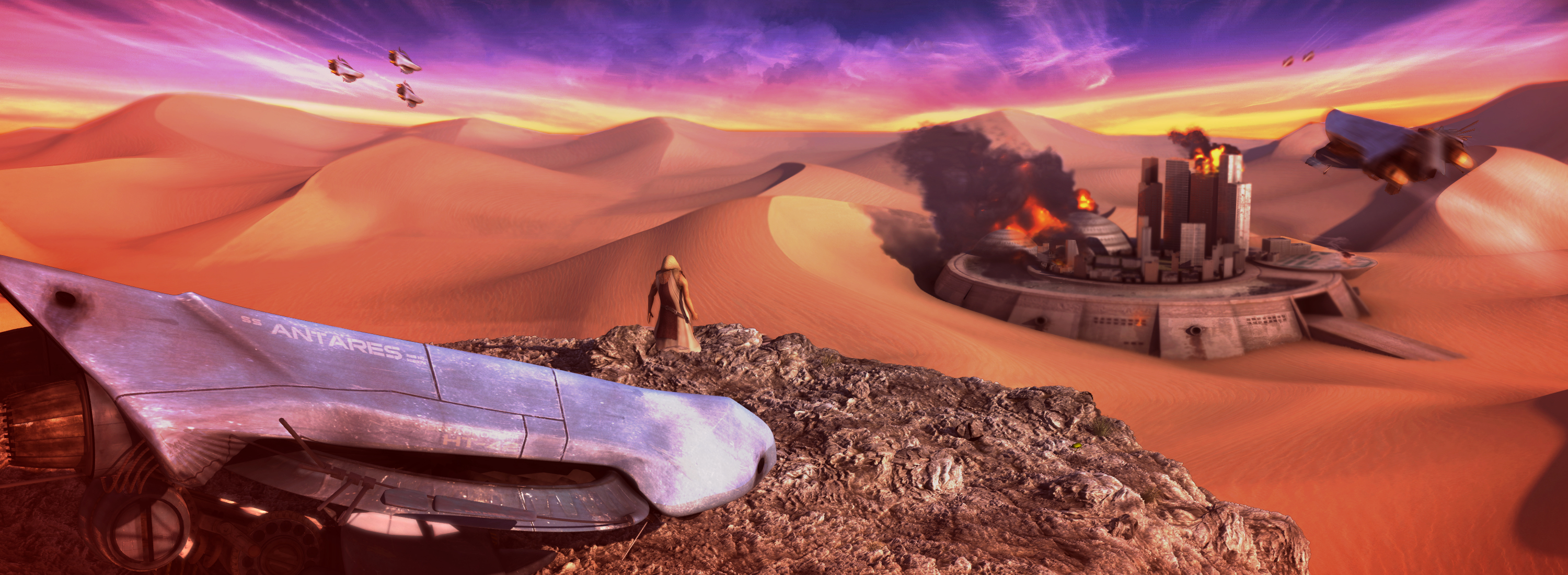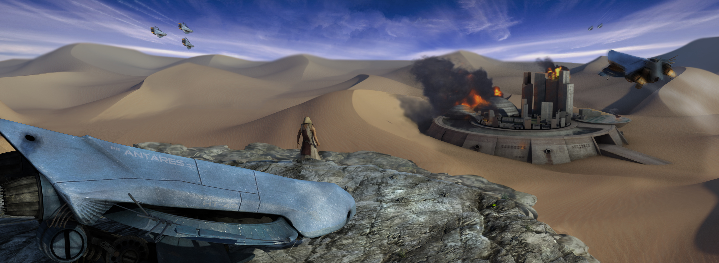 Repito, formalmente está muy bien. No veo grandes fallos. Pero. La iluminación quizá no es muy de desierto, ¿no? Yo haría algo mucho más quemado, como las imágenes que salen del planeta de pitch black o si es un atardecer o algo así, todo más rojo, y la fotografía de fondo un atardecer de estos con tonos moraditos. No sé, algo así.