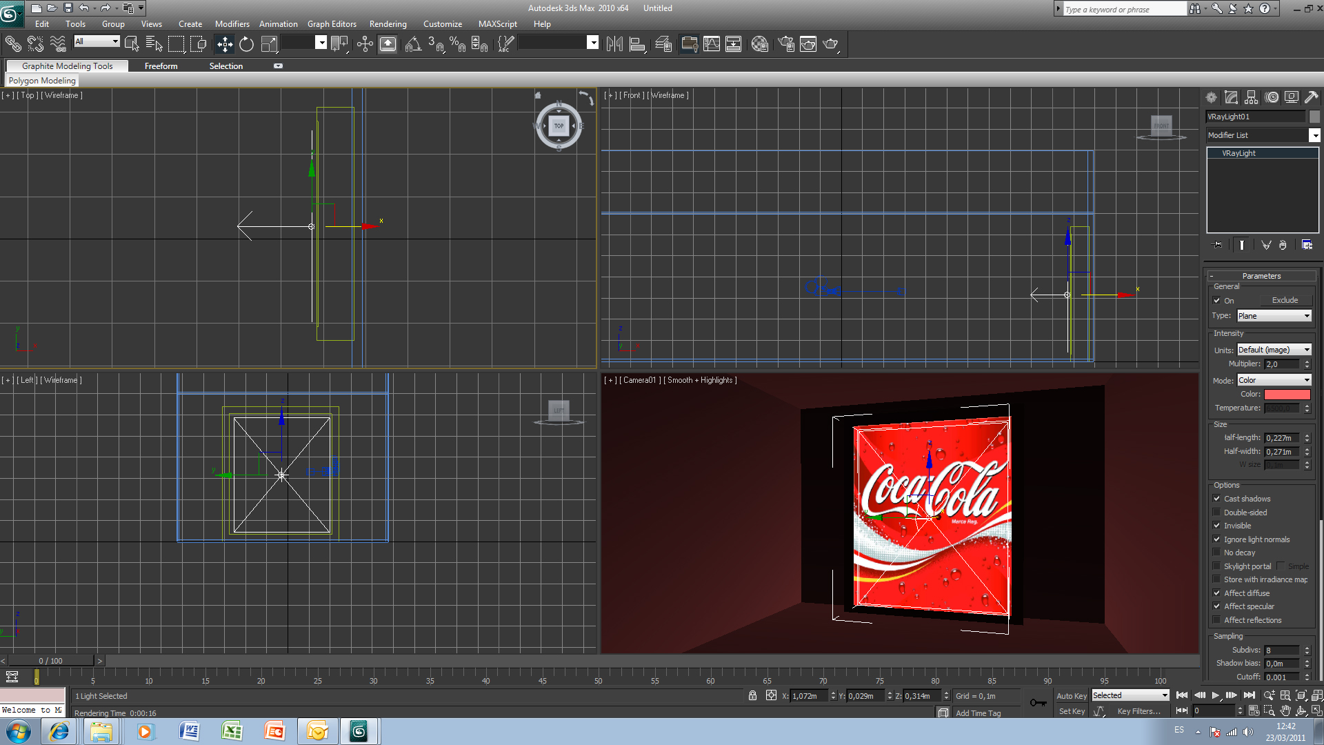 Luego pones una Vray Light delante de lo que sería la lona, con su mismo tamaño, no dentro del cajón de luz, si no justo delante de la lona, esto hará el efecto de luz deseado.
