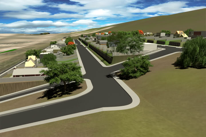 Por otro lado, en la zona que debía tener detalle (el barrio en cuestión) hice un Diffuse con un poco más de resolución para las zonas con pasto y tierra, hice calles, cordones y veredas de la peor forma posible (un Spline extraído sumado por booleanas a una caja) asigné materiales por zonas, trate de representar el relieve del terreno (tiene mucho desnivel por estar en la ladera de un cerro), e incluí mediante Vray proxys árboles y casas de librerías a las que simplifiqué en polígonos y materiales.