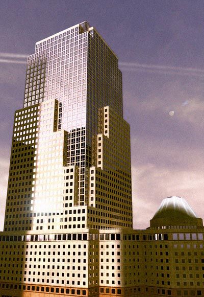 Basado en el world financial center, un popurri de los 3 edificios que lo forman en realidad. Estoy mejorando los reflejos, y tengo que hacer la entrada, probar distintas iluminaciones, etc. Pero no va mal la cosa.