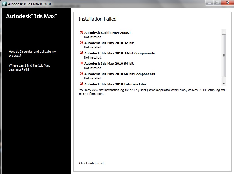 Raro la verdad, pero intenta instalarlo en otra unidad, al parecer no puede instalar el archivo de registro en esa dirección de tu unidad c, quizá sea un virus, la verdad que siempre instale 3ds Max 2010 no solo en mí máquina sino en varias más y nunca me salió ese error. Saludos.