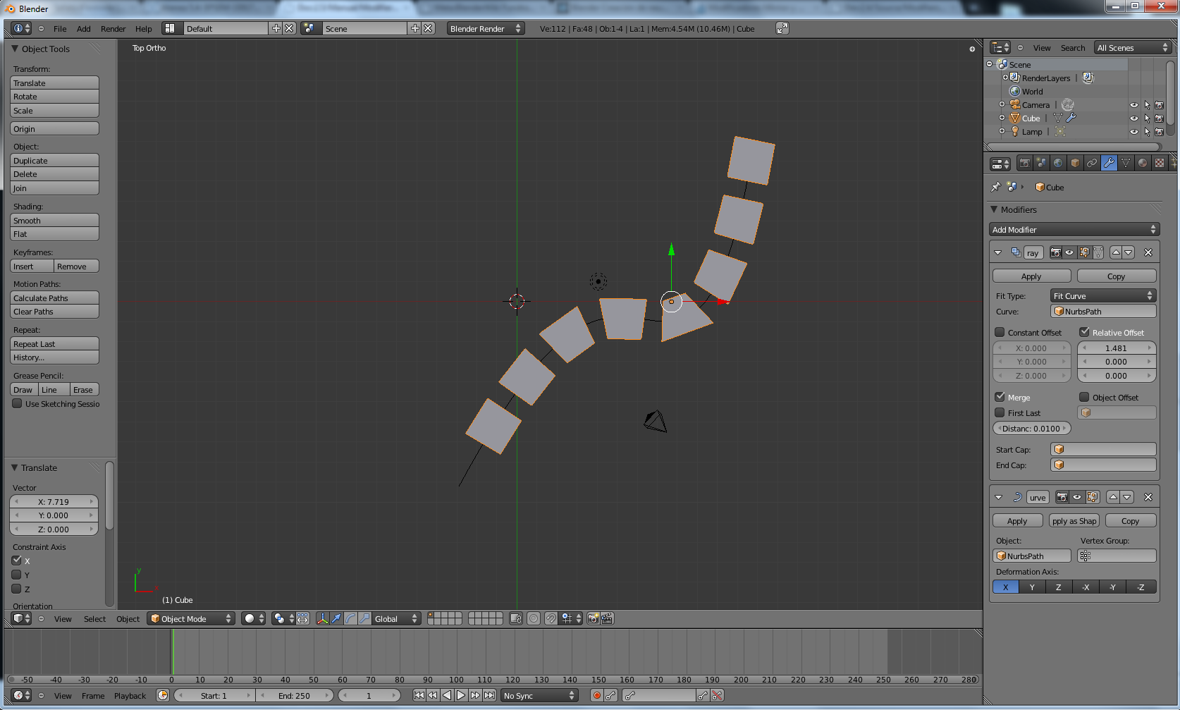 Después selecciona el objeto y haz un clear origin para que se sitúe al inicio de la curva. En el panel object del objeto ve a duplication y pulsa frames y desmarca speed, en ese momento se te duplicara el número de objetos a lo largo de la curva.