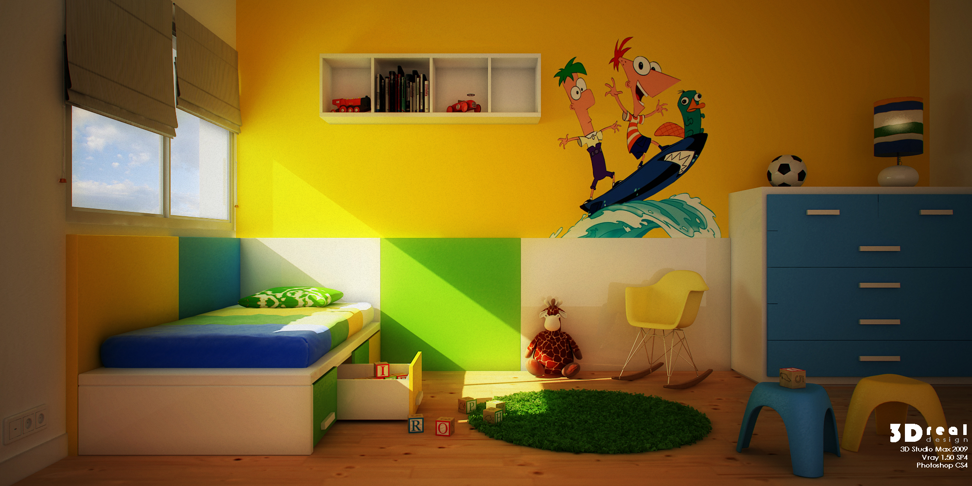 Mira la parte de abajo del marco de la ventana, que te han salido unas manchas raras supongo que, por la luz. Otra cosa, no se te han renderizado bien algunos de los huecos de la cajonera y x último, ese balón no parece del todo esférico, ¿no?