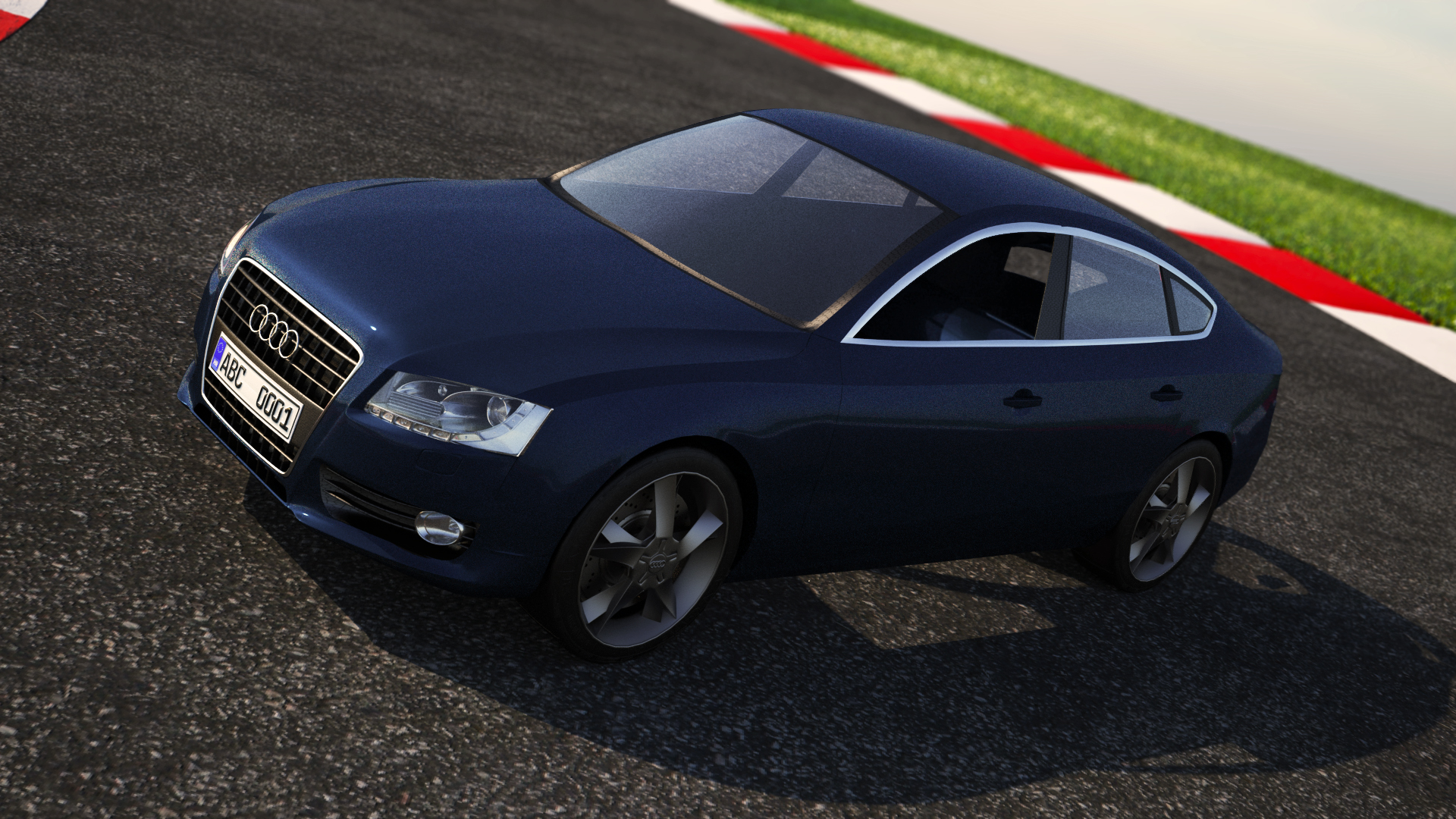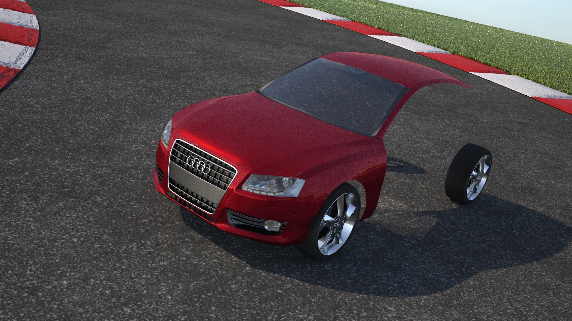 Bueno, el modelado no se ve tan mal, aunque me parece ver algún error en la carcasa lateral. Has hecho cada pieza aparte, o todo de un golpe y luego detacheando? Lo digo porque todo de una pieza y luego detacheando (separando) suelen quedar mucho mejor esas juntas, luego la chicane -las bandas rojas y blancas, no recuerdo si se llamaban así- Tienen un Bump muy exagerado, y el asfalto da la sensación contraria, con poco Bump y poca resolución parece.