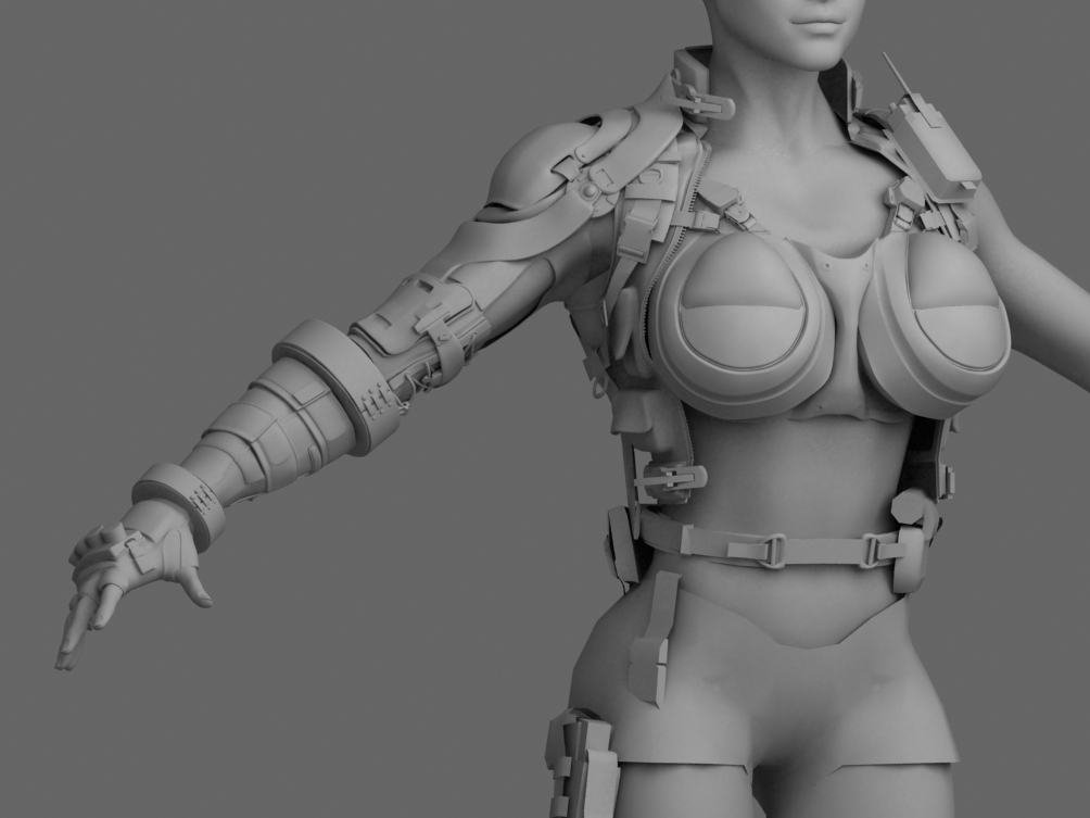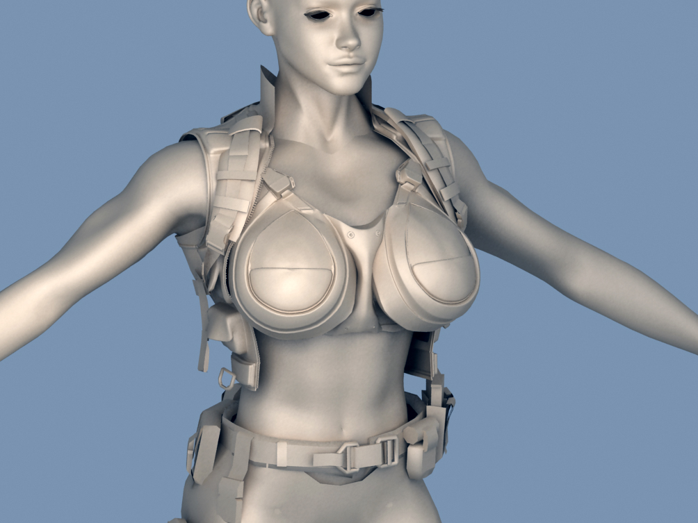 Está quedando bueno. Lo uno que, si no me gusta para nada son esos agujeros en los senos, no justifican su presencia, teniendo en cuenta que los senos no son músculos y es una peleadora, más bien se los reduciría un poco y protegería, porque un golpe ahí puede ocasionarle demasiado dolor y le puede costar la pelea, demasiada desnudez forzada que abunda en los videojuegos y no me gusta tanto, pero como modelo esta 10 puntos. Espero el render.