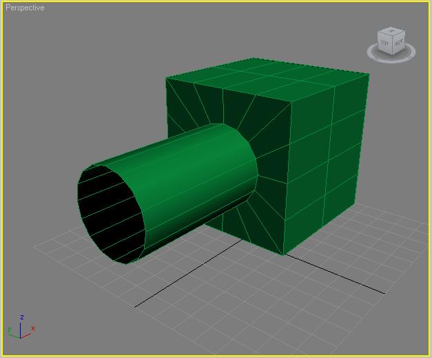 Luego he creado una box con 4 segmentos en Lenght width y height, después convertido a Editable Poly y quitado los polígonos de la cara que da al cilindro. Por último, uno los dos objetos con attach y con la subselección border selecciono el borde del cilindro y el del cubo, y le hago un bridge.