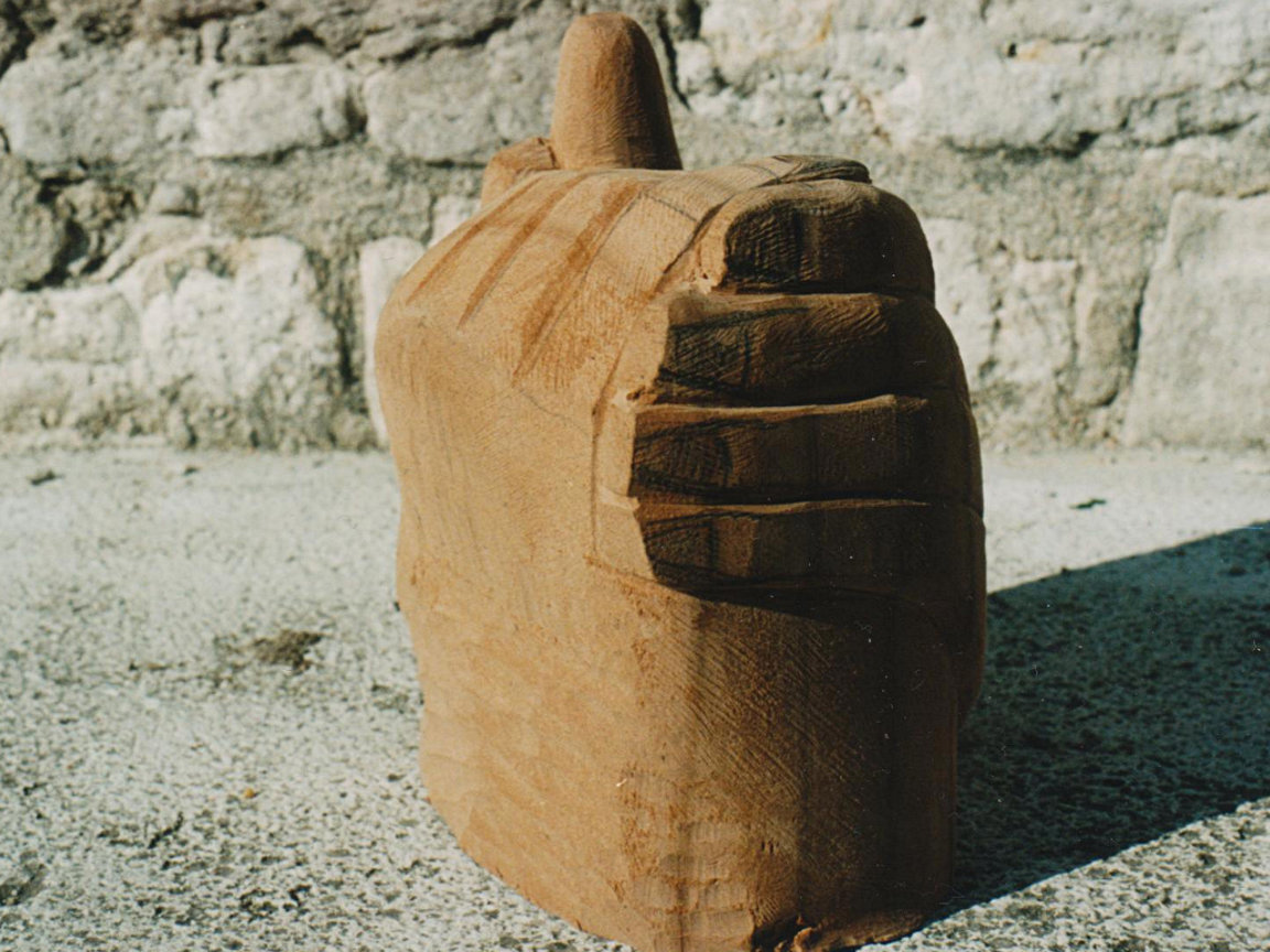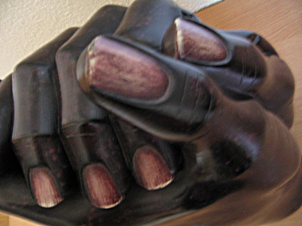 Sobre cómo esta modelada la mano, se han encolado tres piezas de 35x12x2,5cm, para crear un bloque de 35x12x7,5cm, se dibuja un primer bosquejo en cada una de las caras, y se quitan las primeras cuñas con serrucho, en realidad, la pieza es más larga al principio, para tener cuatro bases planas para sujetar la pieza fuertemente sin dañar la parte final, luego se quitan virutas con formones y gubias, que se golpean con mazas de cabeza redonda, o con la palma de la mano, en ciertas partes es más rentable utilizar limas o escofinas, o taladros, después de tallár esta mano me compré un minitaladro (20000 pelas) con unos cuantos cabezales desbastadores diferentes, que utilicé para otras piezas, en el número de gubias estaba limitado a ocho, (5000 pelas cada una).