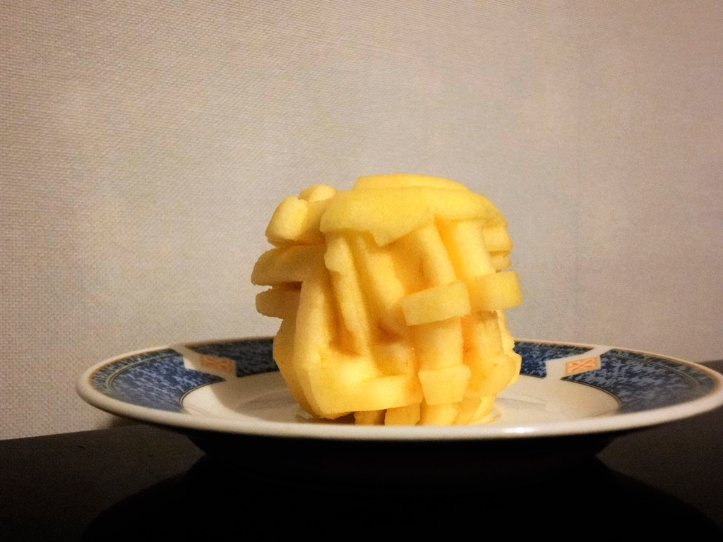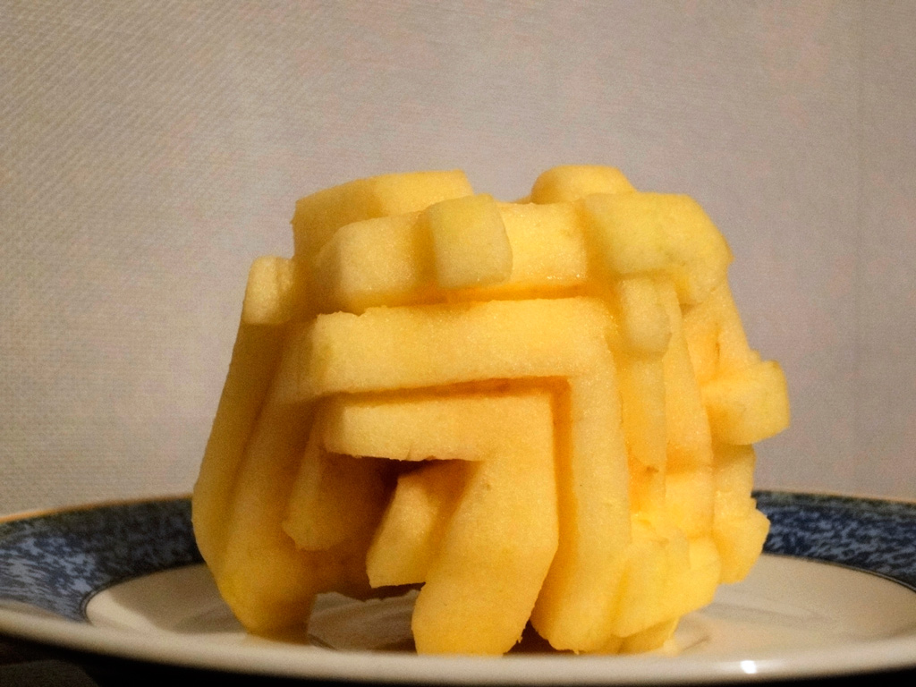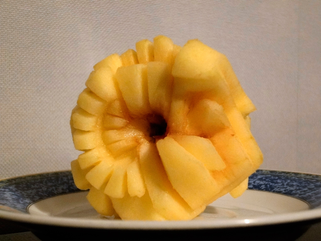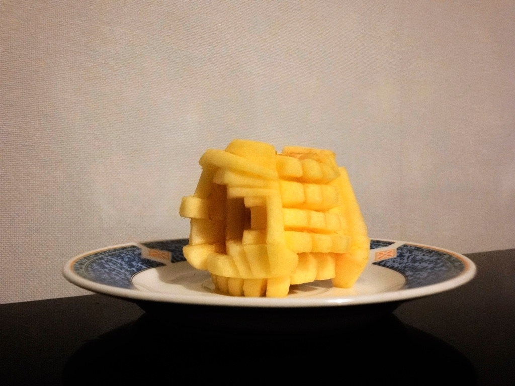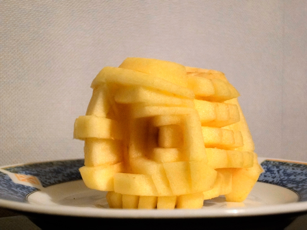 Normalmente suelo ver películas en la pantalla del ordenador, y a veces lo hago mientras ceno, bueno, más bien mientras tomo el postre (generalmente fruta). Cuando toca manzana, me entretengo cortando con formas variadas antes de comerla. Nunca sé lo que va a salir o si va a quedar bien (ya que intento variar las formas cada vez) pero tampoco importa la verdad, dado lo efímero de este tipo de trabajo manual, todas las fotografías son de la misma manzana, pero mostrando distintas zonas.