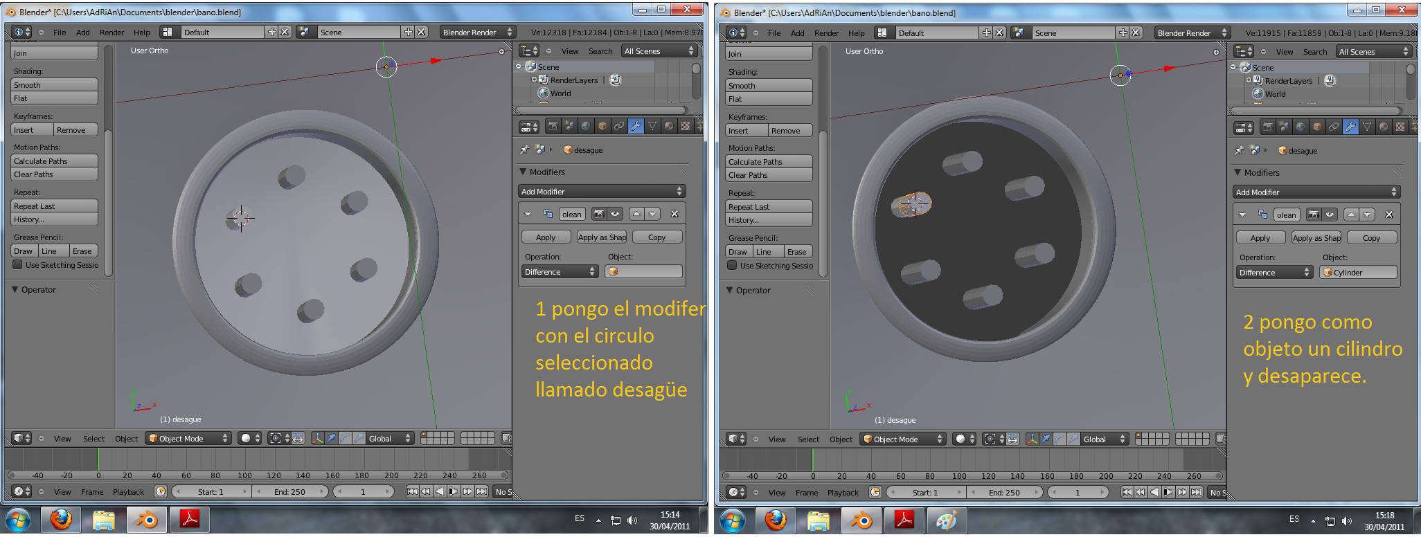 En el círculo del desagüe ya están colocados los cilindros, teniendo seleccionado el círculo aplico el bolean con diference, en lugar de hacer el agujero desaparece el círculo y se queda el cilindro.