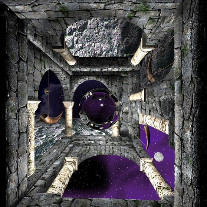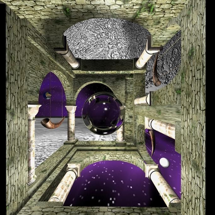 Escher es una de mis debilidades, ¿podrías publicar la imagen de referencia? Así a primera vista, no me convence en absoluto lo que se ve por los portales, parece una textura plana puesta ahí de cualquier forma (aparte de que la línea del horizonte).