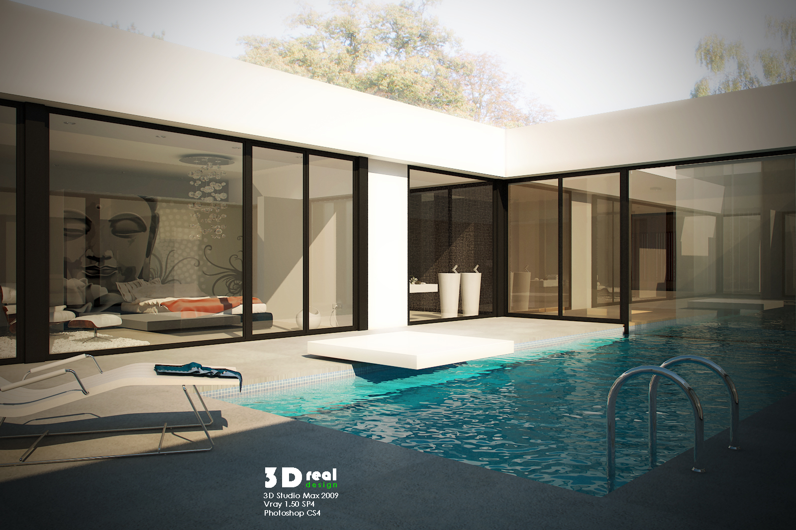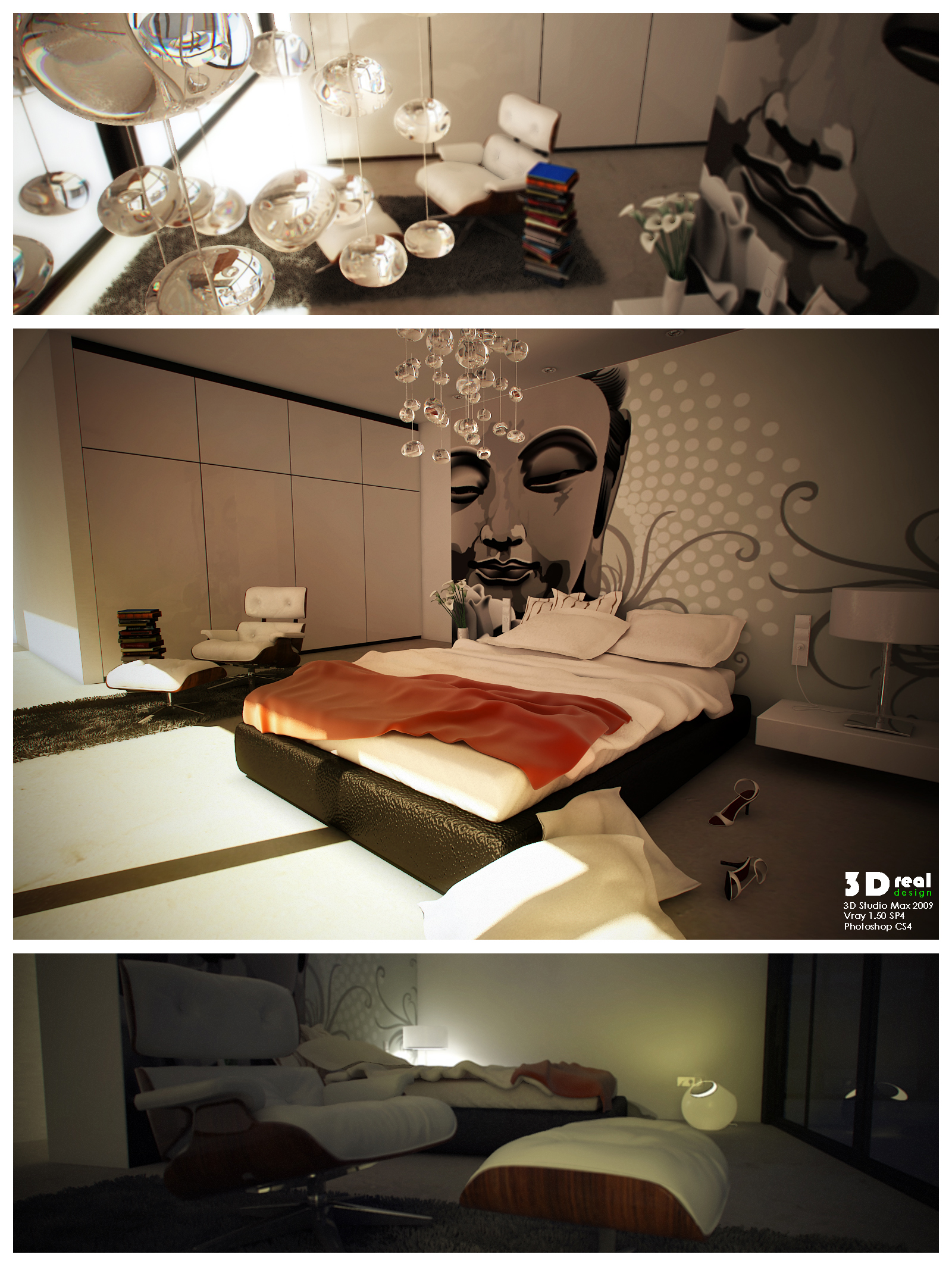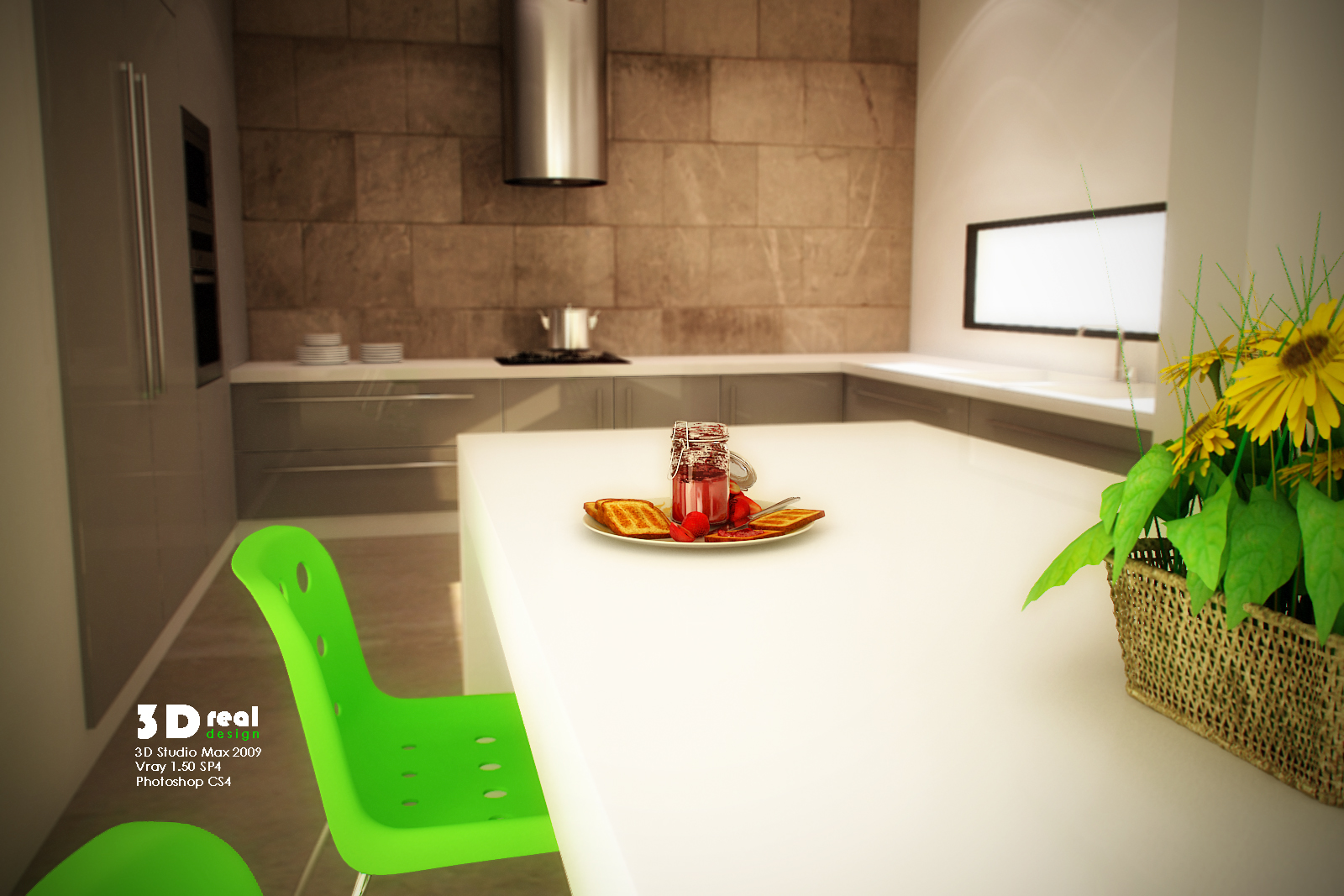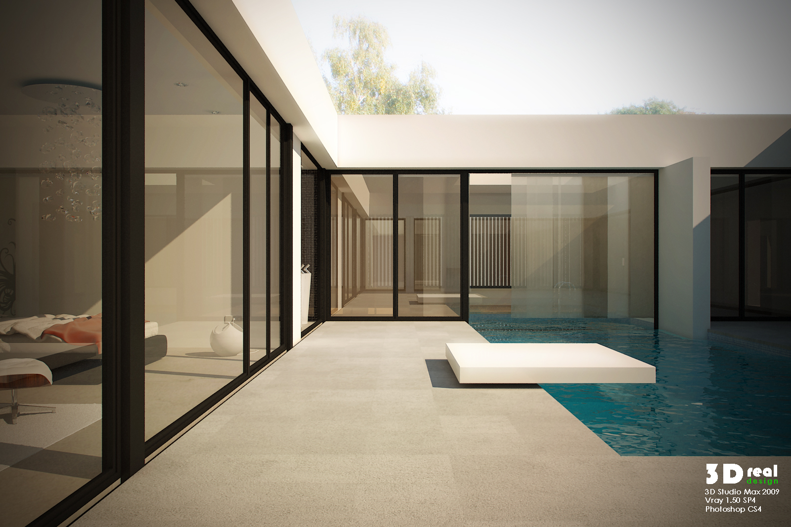 Todos el mobiliario es de librería, menos la cocina y la mesa (son simples), y menos la alfombra, utilizado 3ds Max 2009 + Vray + Photoshop.