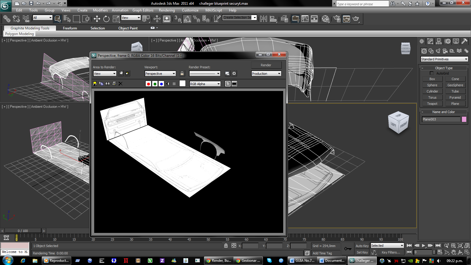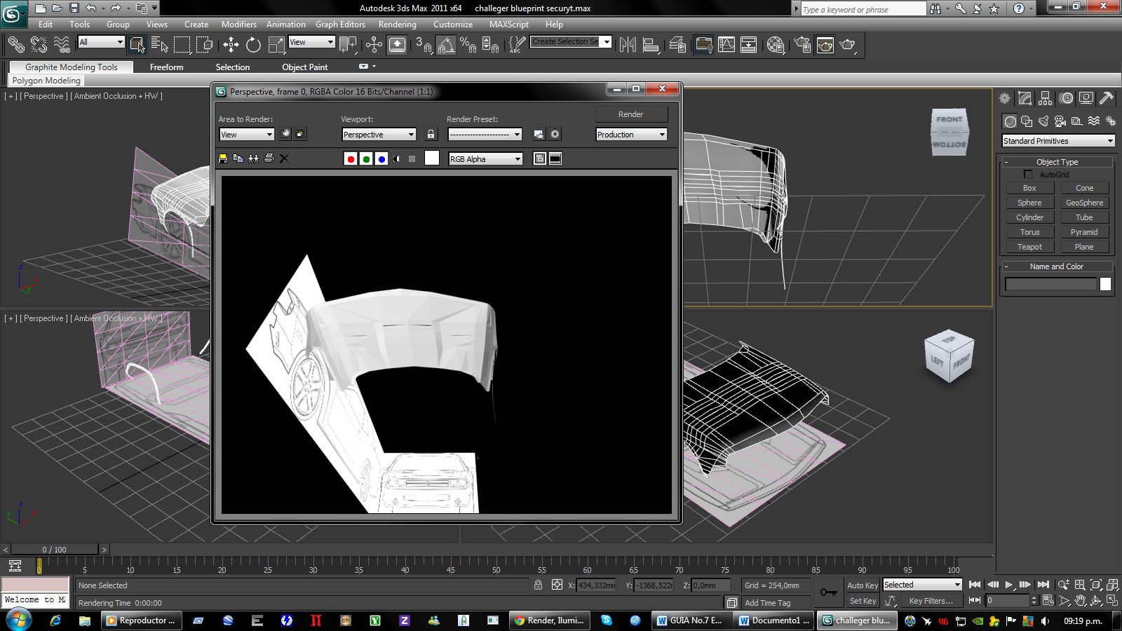 Es precisamente eso lo que me sucedio, hice la parte frontal del vehículo, pero cuando vi, estaba al revés, no sé porque, y por consiguiente la luz le da por debajo, en vez de darle por afuera t_t al igual al renderizar, no sale nada, mientras que si lo renderizo con la cámara viendo la parte de abajo si sale, en las screen shots se explica mejor, ya probé con todo t_t poniéndole ambiet Occlusion, con sombras, sin sombras, dos caras, con DirectX 10, descativando y activando el hardware Shading, etc, pero nada.