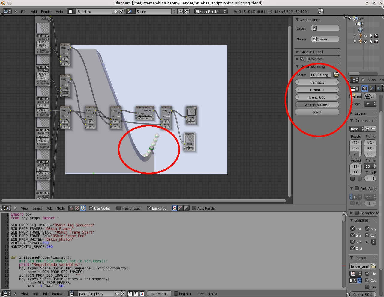 Por ello he hecho un script que, a partir de una animación previamente renderizada, crea una configuración de nodos de composición para ver varios frames antes y después del frame actual (el actual en color normal, los anteriores y posteriores van aclarados).
