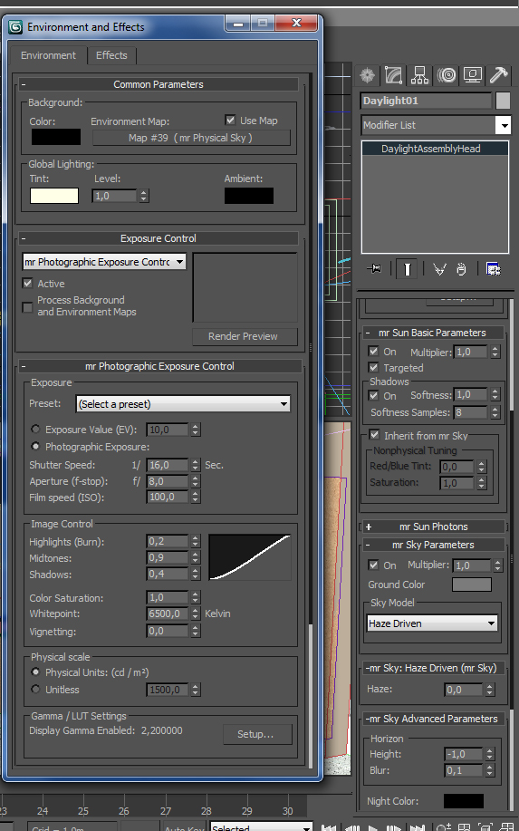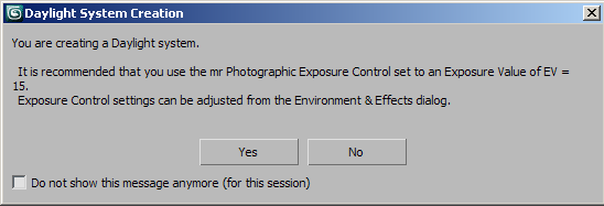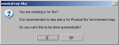 Con el Daylight seleccionado nos vamos al panel de modificación y cambiamos el tipo de luz solar por mr Sun y el tipo de luz del cielo por mr Sky. Cuando se selecciona este tipo de iluminación para el cielo, max consulta si deseamos incluir un mapa de ambiente del tipo Mental Ray Physical Sky. Indicamos que sí. Más adelante veremos el propósito de este mapa.