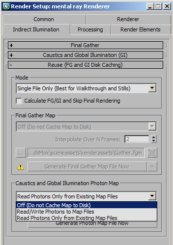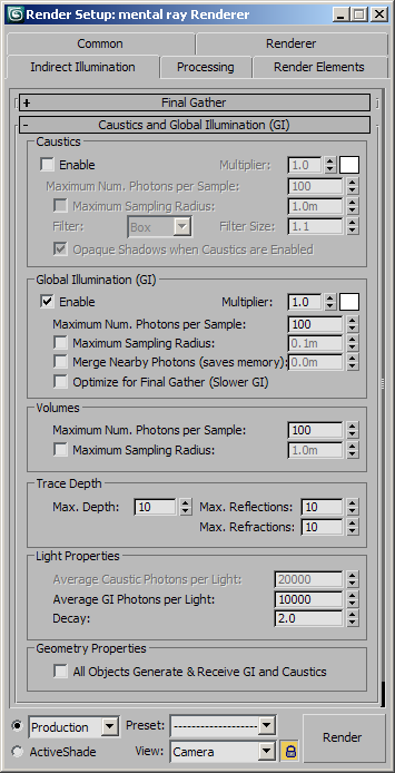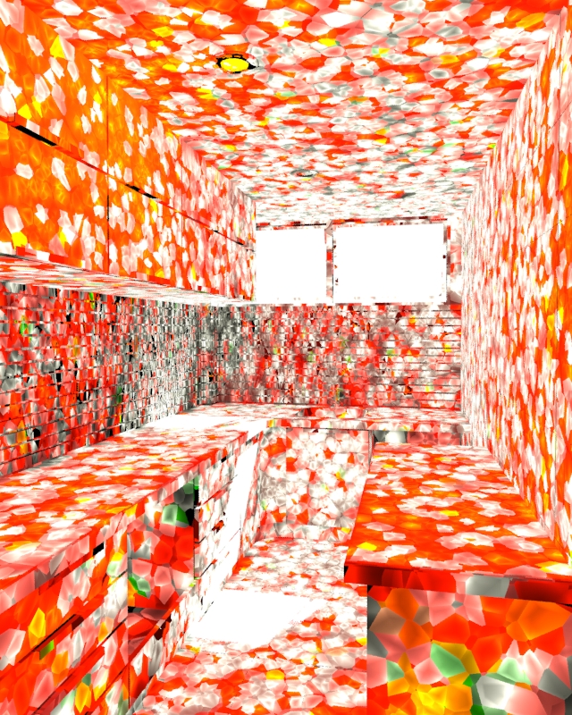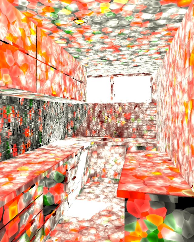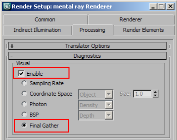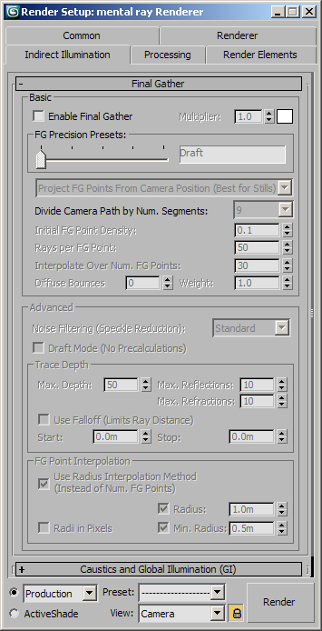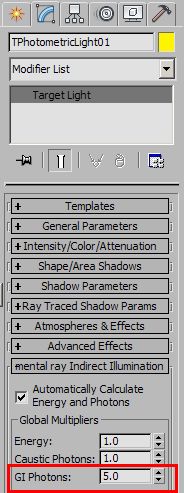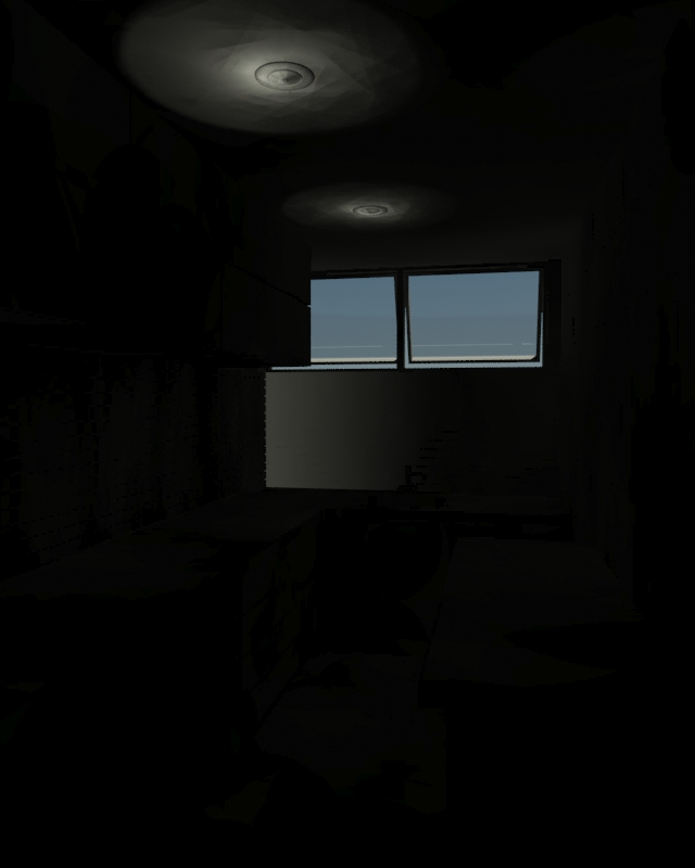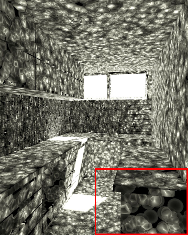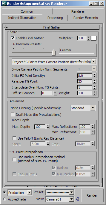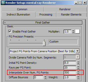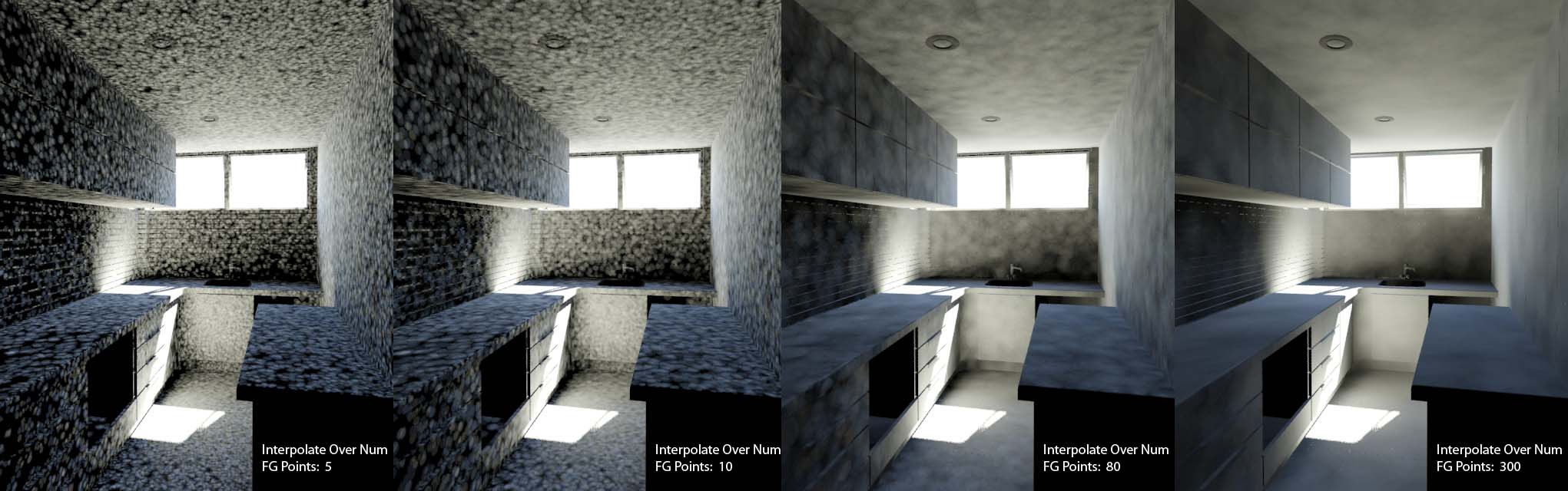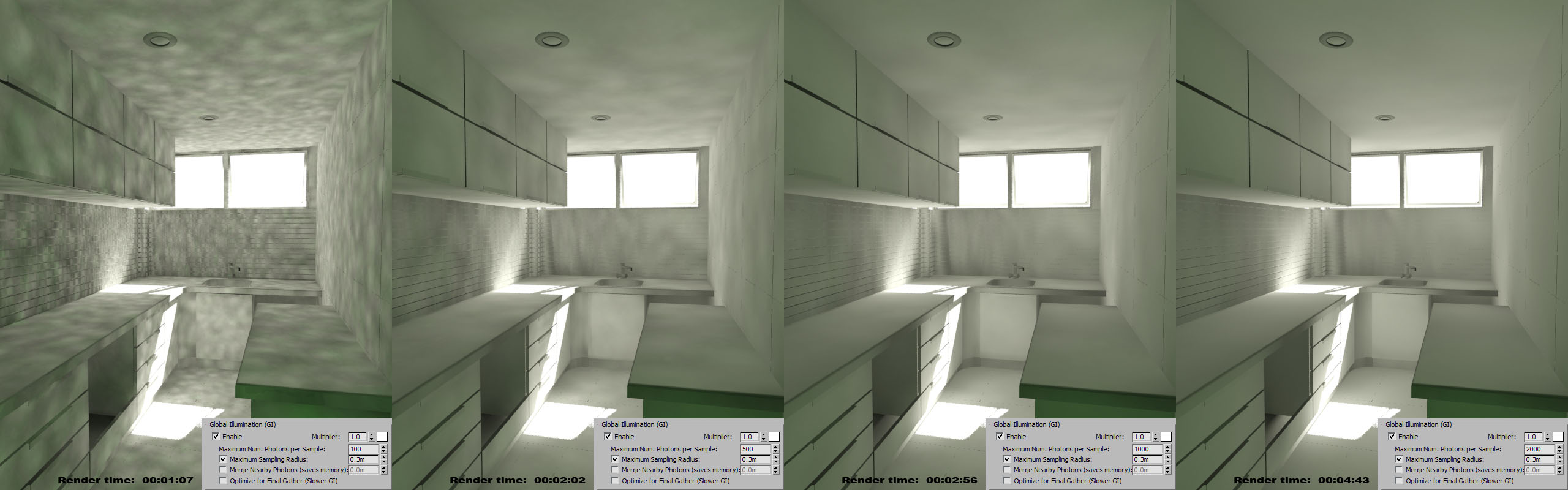 Manchas en Final Gather, como vimos este proceso toma de la iluminación resultante de los fotones, extrae información y la procesa para enriquecer el producto final, el problema es que, si hay un marcado contraste de luces y sombras entonces genera suciedad (manchas claro oscuras).