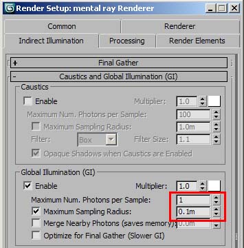 Modificamos el parámetro de fotones por muestreo a 1 (photons per sample), activamos la casilla de radio máximo de muestreo máximum sampling Radius a 0.10m.