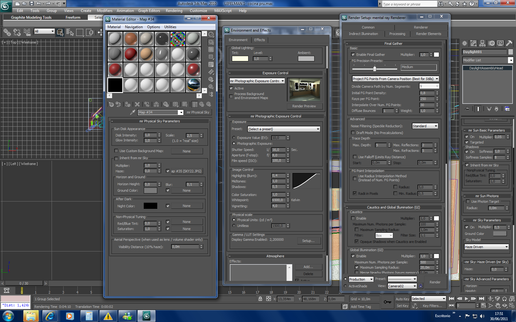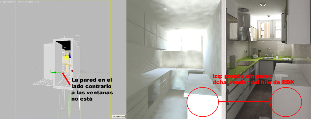 Hola bueno tu aporte sobre el uso de system Daylight, quiero aportar humildemente con algunos puntos 1- Intuyo que trabajas con la versión 3ds Max y no 3ds Max design, de ahí que tienes que configurar el Mental Ray Sky y Mental Ray Sun que ya vienen activos por defecto en 3ds Max design2- El tema de las unidades, en realidad solo importa las que indiques en el tab system units setup, las que figuran en el display unit scale son solo nominales.3- Corrección gamma, es cuan pronto un color tiende a perder luminosidad, es decir oscurecerse. Todos los dispositivos visuales(IPod, celular, monitor, televisión, proyector) representan las imágenes de distinta manera (en términos sencillos, más brillo más contraste, más claros, más oscuros), debido a que trabajan con distintos voltajes y porque la composición de las pantallas son distintas. El uso de la corrección gamma es para tratar de eestandarizar el modo de representación de una imagen y sea apreciado en la medida de lo posible de la misma forma en todos los dispositivos visuales. Este tema es muy amplio, hay distintos flujos de trabajo para aplicar o no la corrección gamma, como adelanto el formato EXR no debe de aplicarse la corrección gamma, y cuando renderizas en Backburner en el modo Split scan line debes tener cuidado porque se aplica doblemente la corrección gamma. Luego en otros programas como Photoshop, composite o Nuke puedes empezar a corregir la corrección gamma. 2.2 es el valor casi estándar, sin embargo, las Mac trabajan con 1.8 además de que el valor 1.8 le da una apariencia más cinematográfica según la opinión de algunos artistas 3d. 4-sobre el tema de fotones, tal cual sucede en la vida real, las fuentes de luz naturales o artificiales emiten energía luminosa (resumiremos el concepto solo a fotones). En el mundo real la emisión de estos fotones es ilimitada, sin embargo, en el mundo CG podemos establecer limites como bien lo explicas. Los fotones son magnitudes de onda que de acuerdo al tipo de luminaria elegida van con una longitud de onda (color) hacia el vacío llegan a la superficie, la contactan y al producirse el contacto la superficie llama a los distintos Shaders que la componen y establece un resultado. Si la superficie es difusa el fotón rebotara hacia distintos lados aproximadamente, respetando el mismo ángulo de incidencia, y llevándose consigo la nueva magnitud de onda de la superficie contactada. Si la superficie es reflexiva el fotón rebotara hacia otro superficie con su misma energía, y si la superficie es color negra el fotón será totalmente absorbido, si es totalmente blanca también será reflejada sin variar su energía. De ahí se entiende que lo que observamos en realidad no es el color propiamente sino la reflexion de las superficies. Imaginen una pelota roja en medio de la sala al medio día, luego mirenla por la tarde, que color rojo es el que realmente tiene la pelota? La composición y tipo de material de la pelota no ha variado, lo que varía es la reflexión de acuerdo a las longitudes de onda que le llegan desde el sol. Hay algunos materiales que no contribuirán con información para cuando generamos cuando Photon Map. Coloquen elementos de color negro o elementos con reflexión especular y hagan un diagnostico de fotones, verán que no se almacenan fotones en esos elementos.5- Lógicamente al usar Mental Ray y system Daylight debemos si o si trabajar con materiales Arch& design o los Autodesk materiales, ya que estos tienen un comportamiento físico adecuando, (ley de la conservación de la energía)6- Veo que la escena tiene muchoblanco podrías usar un tip, en el panel environment and effects, en la sección del whitepoint coloca el valor 100 de esta forma no se teñirá de celeste por el uso del Physical sky7- Yo normalmente trabajo con el exposure value en 12-13.5 para interiores, me sorprendió ver que le indiques valores mucho más bajos.8- Muy buen aporte con lo del bleding y la forma de cómo controlarla 9- Podríamos aportar mejor comportamiento de los fotones si aplicamos un Photon basic Shader a alguno de los materiales10- Skyportal ayudará muchísimo para la iluminación11- Ahora hay nuevas técnicas que podrías emplear con los fotones como los Importons. Te felicito por la iniciativa y adelante con los tutoriales. Saludos,Richard.