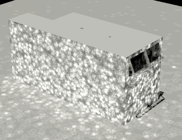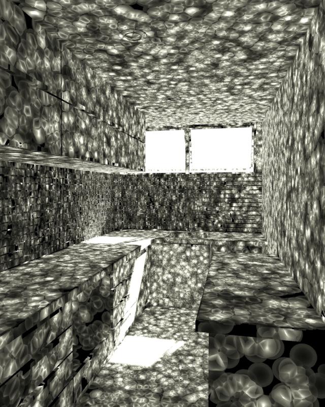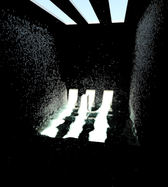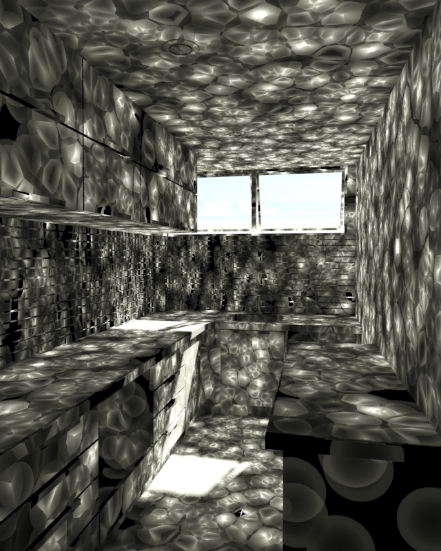 en ella tenemos solamente los rayos trazados sobre la escena y que han obtenido información de las áreas iluminadas, la luz entra por la parte superior, se refleja en el agua y el proceso de extracción toma tanto de la luz reflejada como de la luz que penetra.