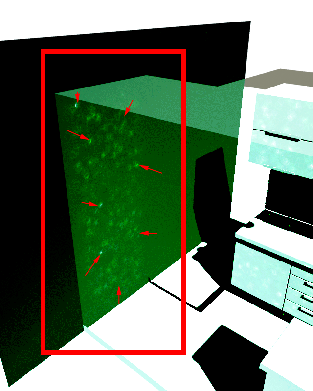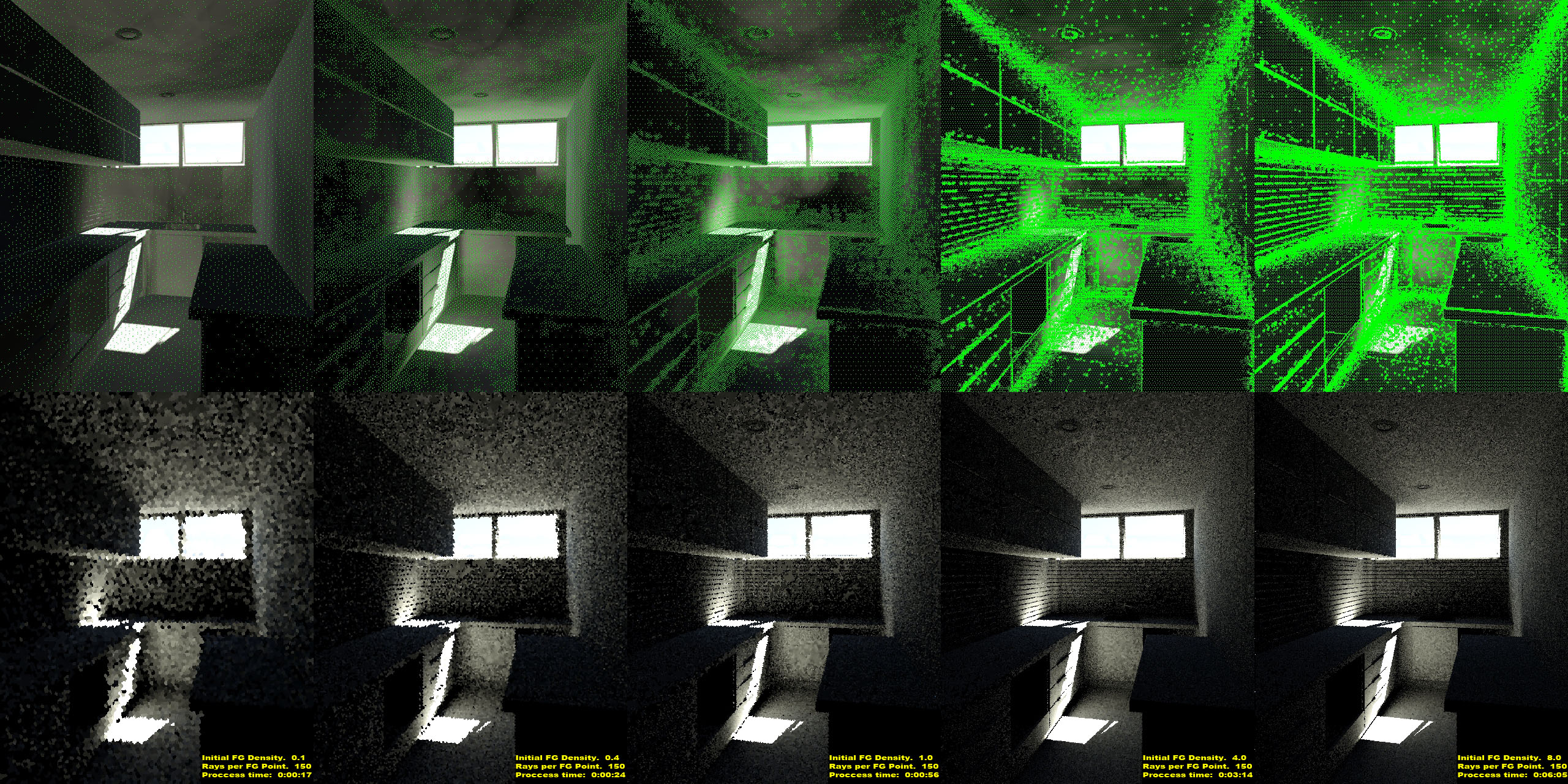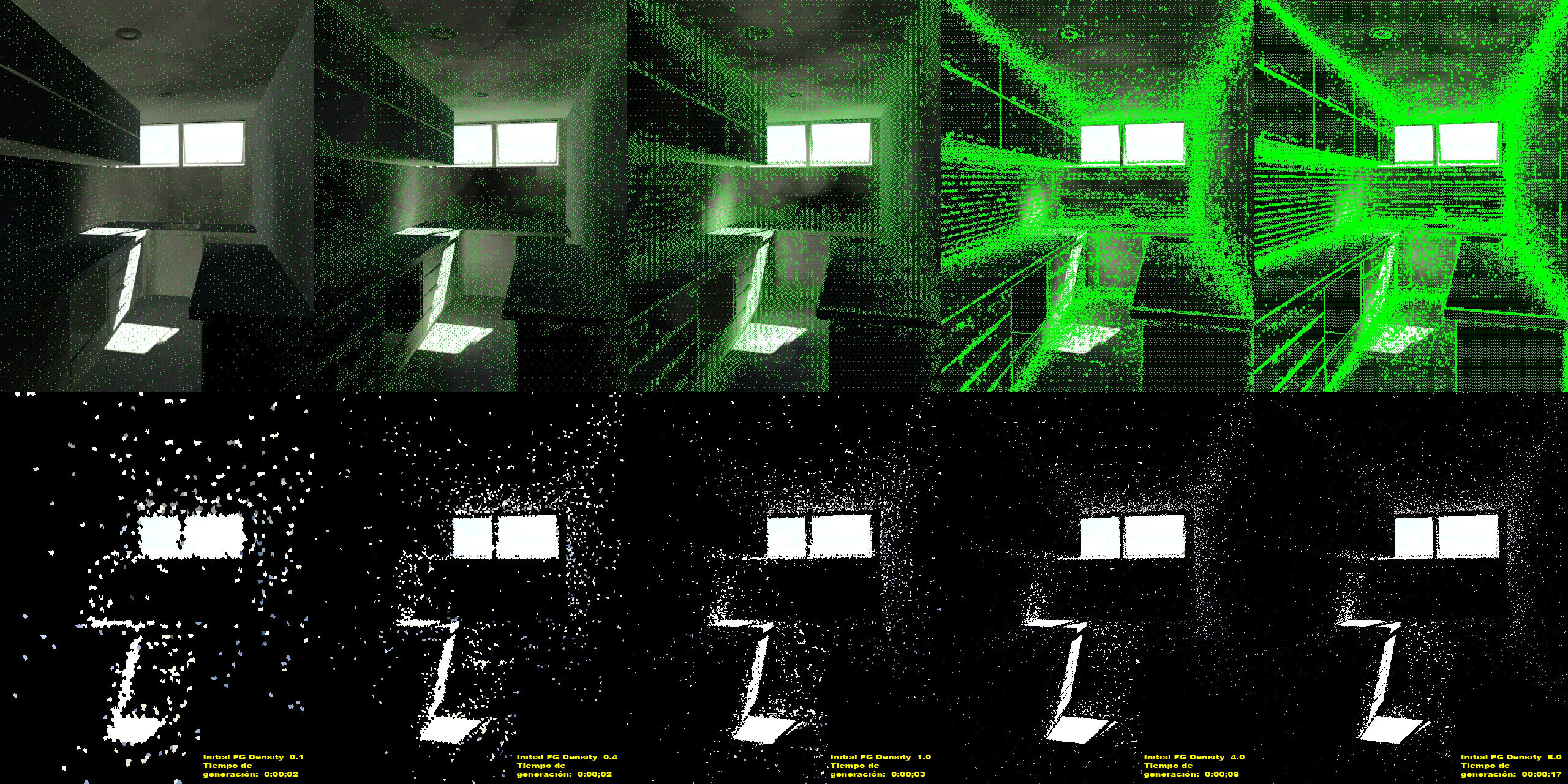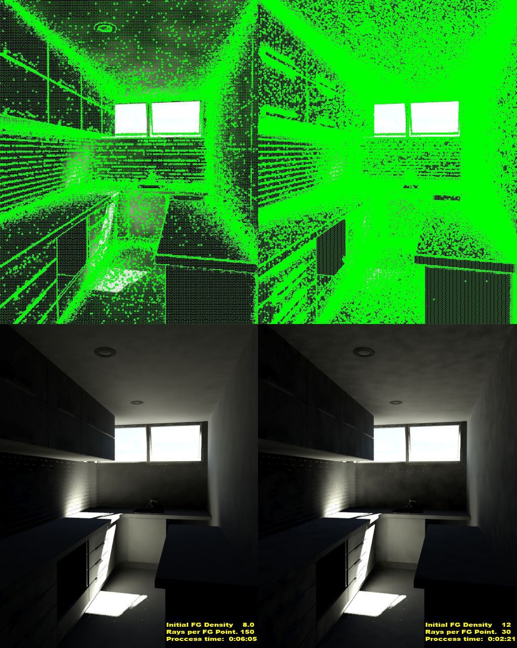 <-en esta imagen podemos observar que el generar una densidad muy alta no consume mucho tiempo (rays per FG points = 1), podemos ver la densidad (puntos verdes) mediante la herramienta de diagnóstico diagnosticos - Final Gather, abajo podemos ver los tiempos que se toma generar cada densidad.
