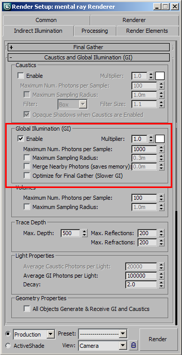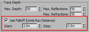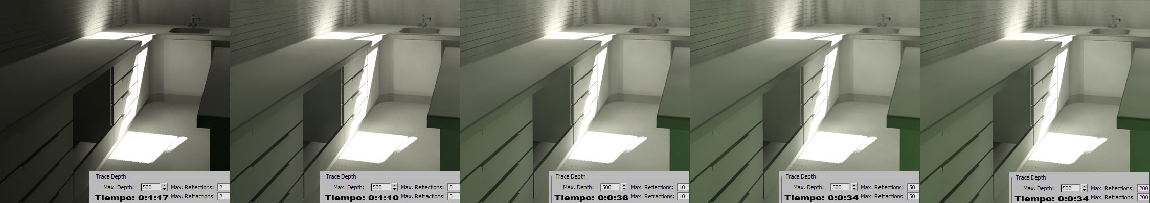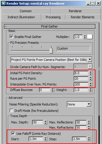Entre las opciones de Final Gather se encuentra el poder limitar la distancia del radio de búsqueda de información lumínica, si se encuentra información en un radio dado entonces se toma ese valor, de lo contrario se toma el valor de la luz exterior skylight.