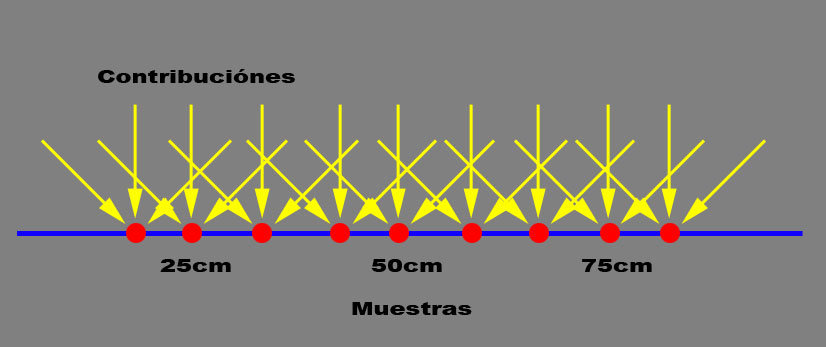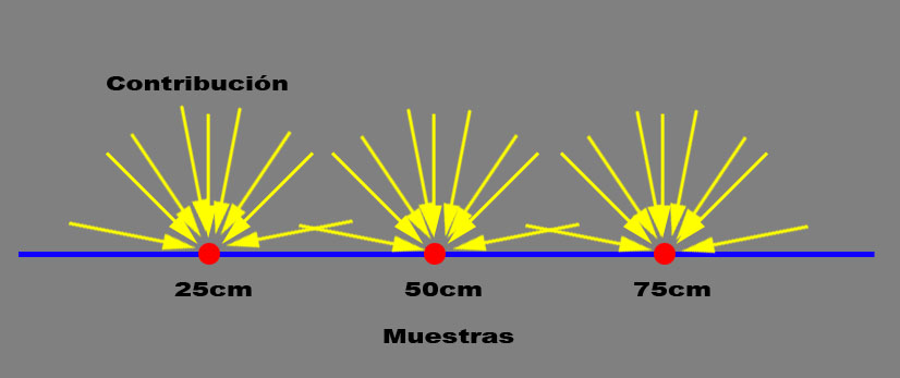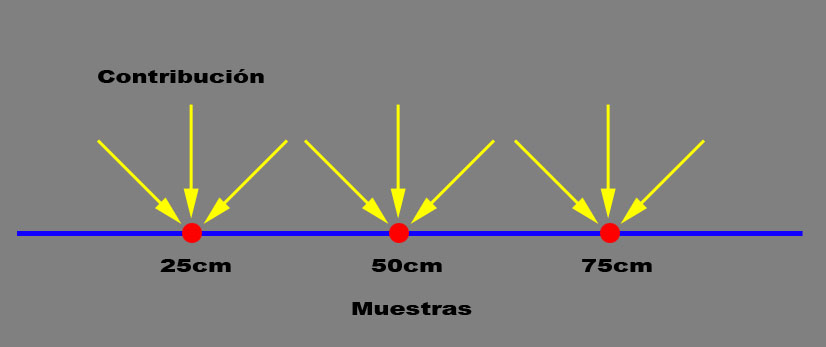Digamos a 25cm, a 50cm y a 75cm. Entonces tenemos 3 puntos de muestra, ok, ahora de diferentes lugares aleatorios (3 por ejemplo) proyectamos hacia el punto ubicado a los 25cm la cantidad de luz que contribuye cada uno.