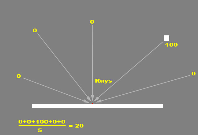 Entonces el promedio de ellas es de 20(lux). Pero si se observa otro punto cercano y el promedio de las contribuciones tomadas es cero, tendríamos una muestra con 20(lux) a la par de otra con 0(lux), lo cual es un contraste muy marcado y lo percibiríamos como una mancha. |