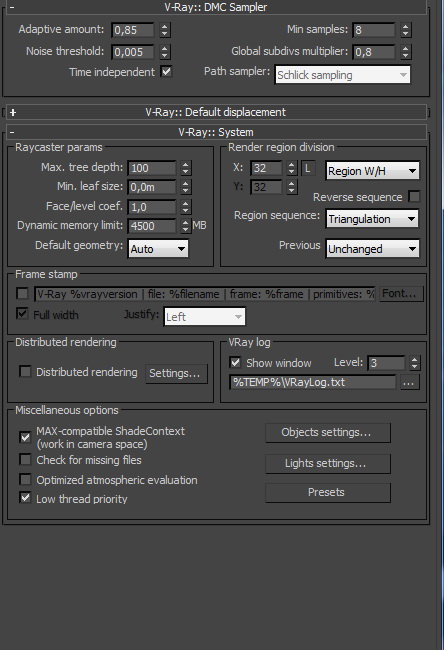 Les dejo mis renders mi PC es Core i5 64bits 8 Gb Ram Vray max 2011 Vray 2.0 utilice gamma del 3dsmax y Vray Sun con 1.0 de intensidad el environment es es Vray Sky copy de los set de render los parámetros los subí en imágenes para que vean en que estoy fallando gracias.