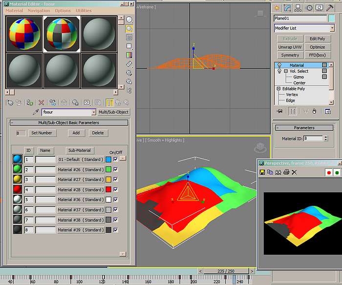 Tengo un plano muy subdividido y quiero que en cada frame un polígono vaya cambiando de id hasta formas una palabra. Lo vos a usar con un multisubobjeto.