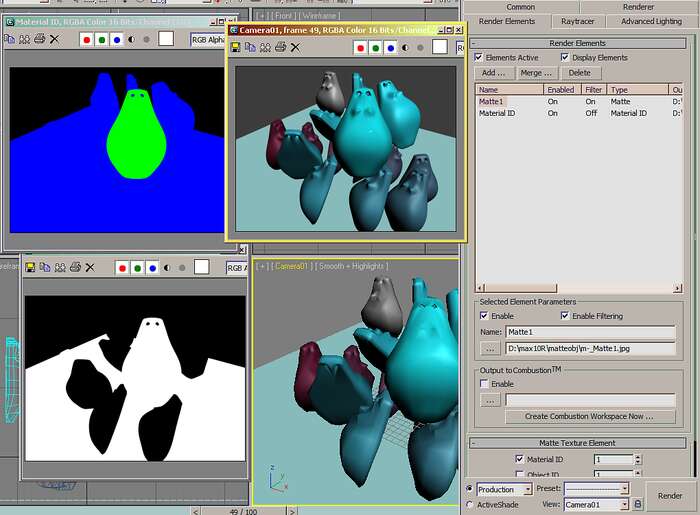 Y no hace falta hacer más que dos pasadas de render: una sin el objeto a recortar, y otra usando los Render Elements: te serán muy útiles matte, material id y object id.
