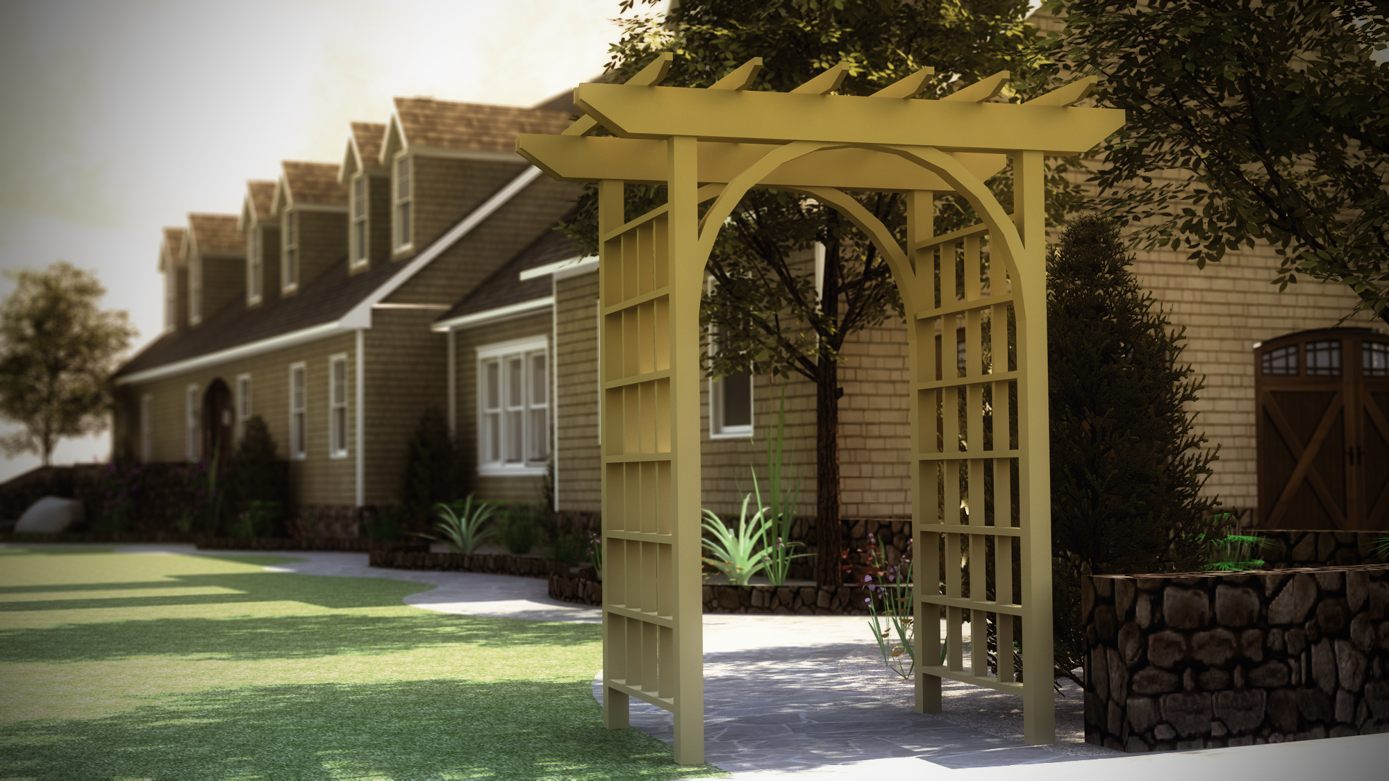 Me gusta más esta segunda imagen que has subido, ya que el muro de piedras queda muy plano, también le podrías haber dado algo más de movimiento al terreno del césped y quizás con una vallita encima del césped quedaría mejor la imagen, dando una sensación de urbanización privada. Buen trabajo Paco.