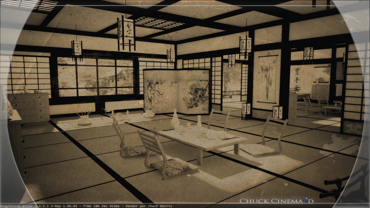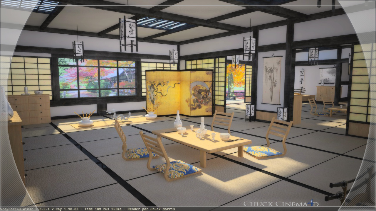 Esta buena =p, yo giraría un poco eso si las lámparas que están colgando se ven muy rígidas toscas, y quizás darle más translucidez al separador de ambiente, y a las ventanas de papel, como para que se vean las sombras de lo que está detrás.