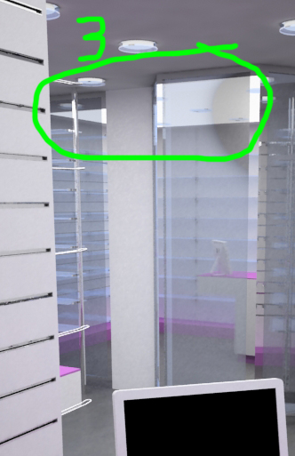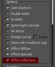 Hola. No sé cómo solucionar este problema de reflejos. Nº 3: imagen con 3dsMax + Vray 1.5. Un vidrio en el que se refleja el plano de iluminación de la escena que es una luz de Vray.
