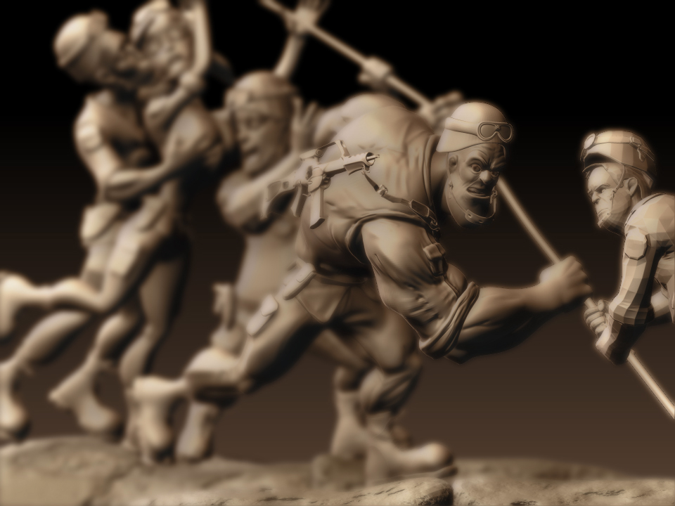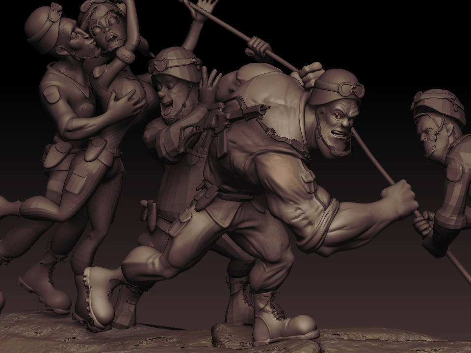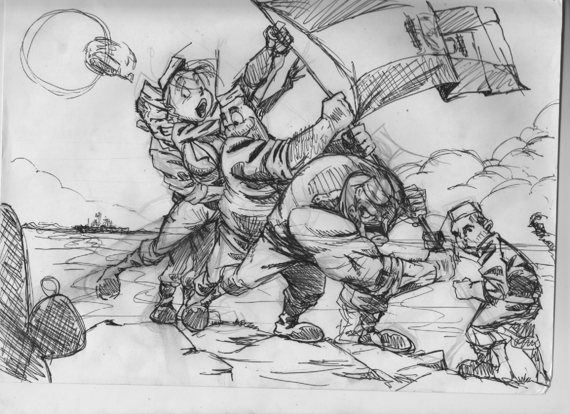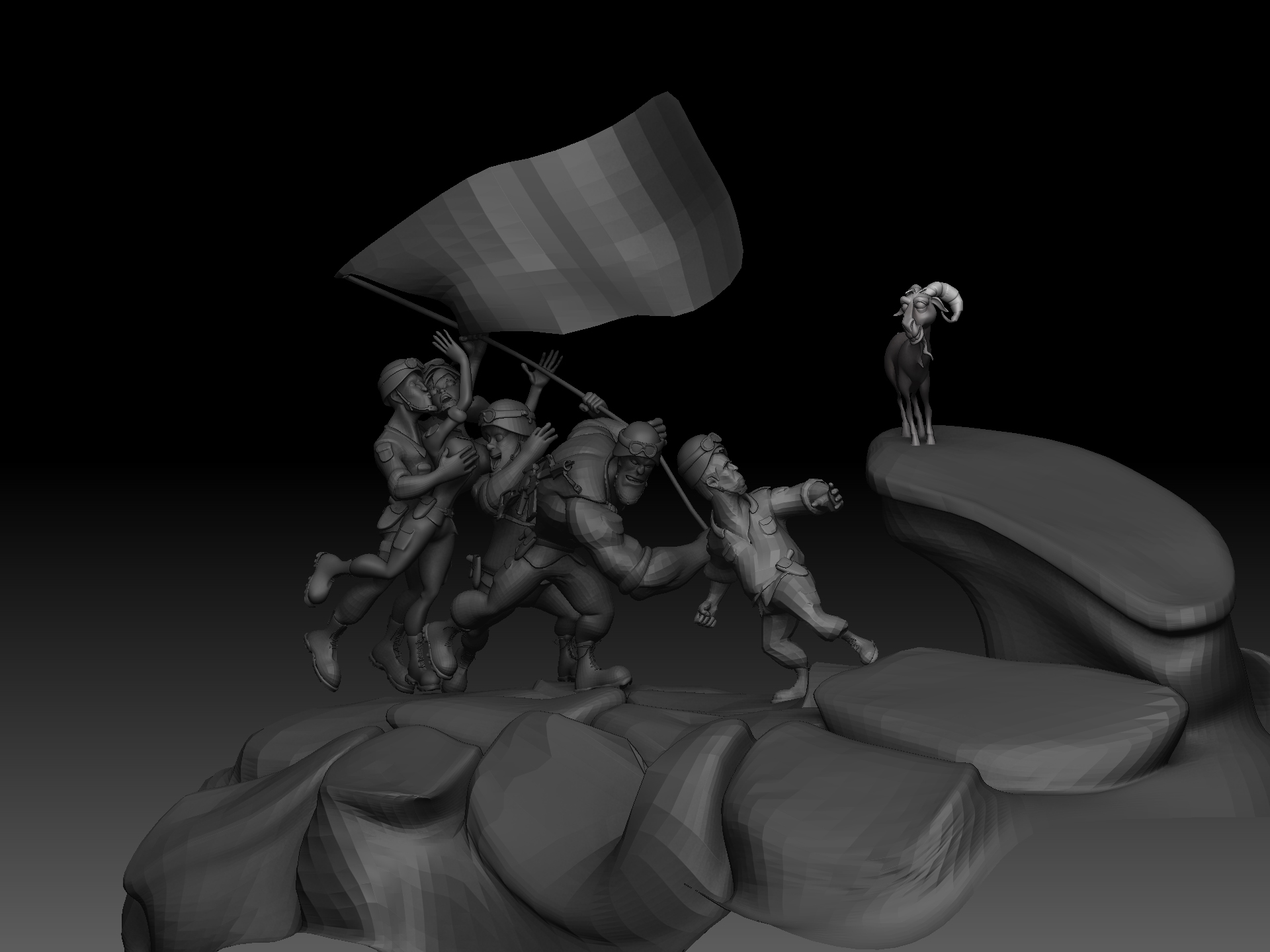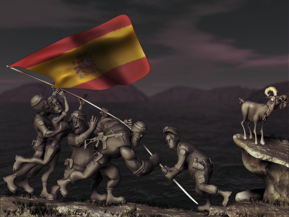Aún no está ni mucho menos acabado, pero bueno, ya se puede ir mostrando, es la versión en 3d del dibujo que en su día subí a mi blog, parodiando la fotografía de los soldados americanos coronando el monte japonés de iwo jima, nosotros, el islote del perejil, lo mismo, vaya, posdata: el chiquitín que mira a la cabra, es mi padre, adjunto también el boceto que hice en su día, y que ha servido de concept, por favor, criticad, comentad, discutir, lo que sea.