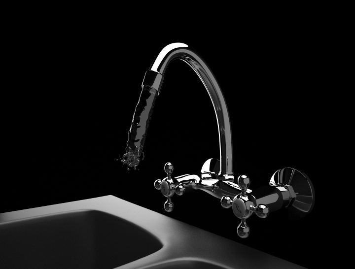 Mira Adobe Photoshop tendrías que ver cómo lograr que ese cromo sea más cromo y no se vea tan plástico, y Adobe Photoshop con respecto al agua, está muy uniforme, el agua de los grifos sale del tamaño de la boca del mismo, pero a medida que va bajando esta se va separando entre sí, poniéndose más delgado el chorro de agua y a su vez más disparejo, si supiera usar el RealFlow te ayudará, pero ni idea de cómo usarlo, solo te estoy dando mi punto de vista, saludos.