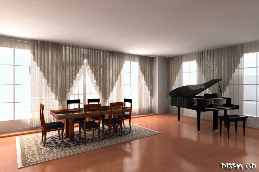 Antes de nada decir que está echa la escena con max6 y Vray. Hola hola, muchas gracias por los comentarios y consejos, es verdad que nadie tiene un póster en el salón donde tiene el piano, pondré un cuadro guapo con un marco un poco churrigueresco, más figuras y sobre todo unos cuantos muebles, el salón es muy grande y hay pocos muebles, lo de la lámpara lo pensé, pero luego no se la puse y está claro que hay que ponerla, en definitiva voy a corregir la escena con vuestros consejos y la subo en cuanto la tenga. Muchas gracias.