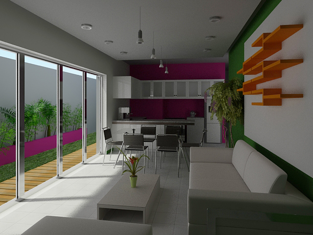 Le faltan cosas para parecer más real, pero hay otras cosas que me parecen interesantes como el juego de colores y la distribución. Quizás giraría un poco la cámara para que la perspectiva no fugue hacia el centro.