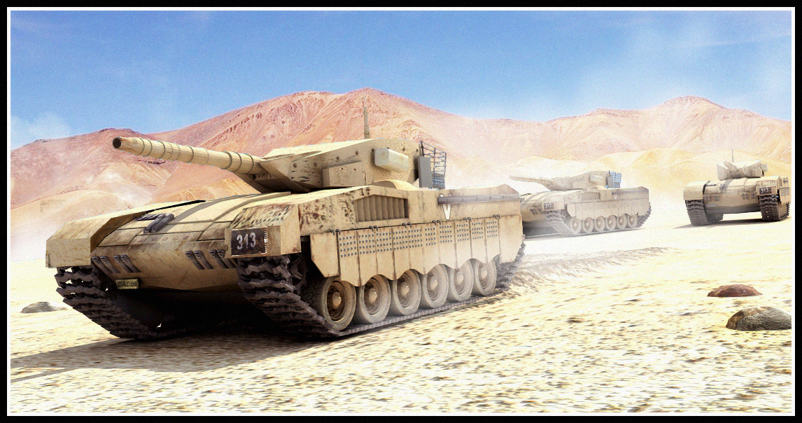 Me gusta, pero lo que te dicen, le falta más detalle y retocar algunas cosas. Yo hubiese numerado cada tanque con un número distinto, todos llevan el 313. Luego lo de las texturas que ya te han comentado, y otra cosa es que, al menos el tanque en primer plano parece que no llega a tocar el suelo, pégalo un poco más a él. O añádele alguna nube de polvo entre las cadenas y el suelo que se note que está rodando con ganas. Un saludo.