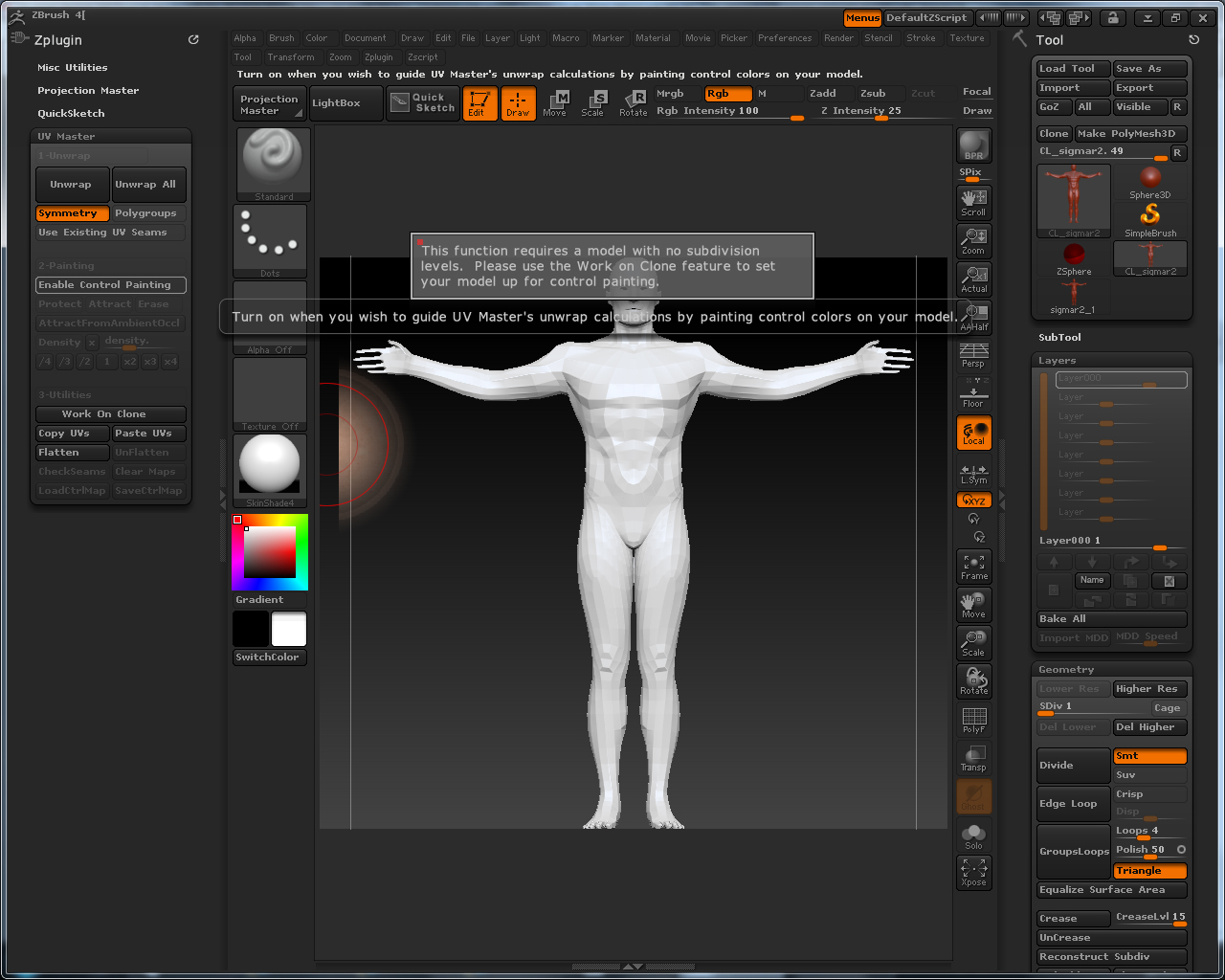 Hola estoy trasteando con ZBrush y mirando tutoriales y llevo días atascado con lo siguiente: Estoy intentando sacar los mapas de textura, pinto la textura y cuando voy al UV máster le doy a work on clone en principio se clona, pero.