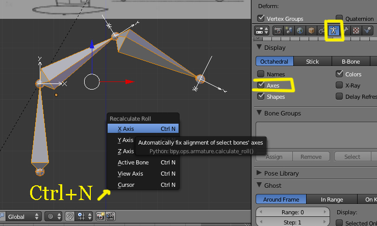 Mira he estado haciendo una simple prueba, creo una armadura. Me meto a modo edición. Selecciono la cola (creo que es la cola, es la parte que no tiene el trocito de pirámide), y lo muevo más o menos para ponerlo horizontal (como si fueran unos brazos) sigo con la cola seleccionada, y extruyo. Ahora este nuevo hueso, si lo muevo en horizontal a la vez que se está extruyendo, pues parece no cambiar el giro, pero si lo bajo, veo como comienza a girar, vale pues nada lo que hago es restringo la extrusión a x para que no se me mueva, hago click para crear el hueso, ahora miro los ejes (los pongo como me dijiste) y veo que ya no tienen nada que ver. El que debería ser z es ahora en el nuevo x, el que debería ser x es ahora z y marca además en dirección opuesta y el único que se mantiene es el y, como verás no he hecho prácticamente nada, tan solo extruir, y ya estoy obteniendo unas cosas muy raras, es esto normal? O porque ocurre esto? He estado probando con este ejemplo del control-n y bueno, no sé muy bien que signifian las primeras opciones de x y z, porque las he pulsado y me gira los ejes, pero no se en base a que, lo que si he conseugido ha sido seleccionar los dos huesos, y luego active bone, y así si que me ha igualado los ejes. Algo es algo, pero ves, me resulta rara la manera de trabajar de los huesos.