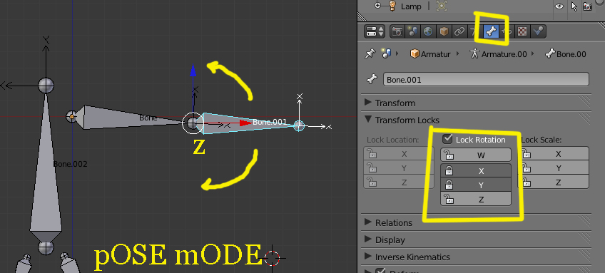 Los huesos puede girar y moverse en todas las rotaciones, a no ser, que les pongas bloqueos (loock). Subo la primera imagen en que se ve, que bloquea dos ejes y ya solo se puede rotar en el que queda.