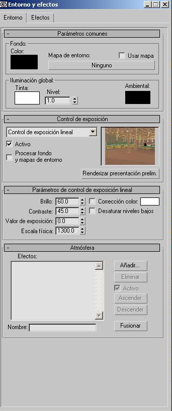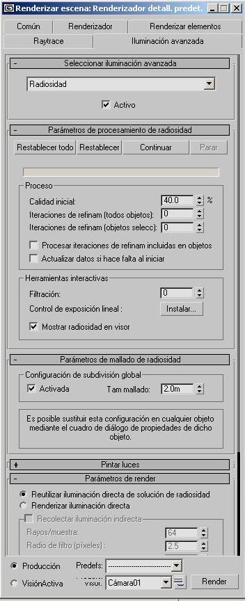 Vamos a ver, para empezar en el environment pon el exposure control en logarítmico, sube algo el contraste y lo más importante, en la ventana de la radiosidad pincha en proces refine iterations estored in objects y no le pongas a todos la misma (como dice Marisa, cada objeto tiene un tamaño y ocupa un volumen distinto en la escena, también no tiene nada que ver la geometría del suelo con la de las vigas del techo, por ejemplo, por lo que cada objeto ha de tener su propio Mesh size y refine iteración si quieres que todo te salga como dios manda.
