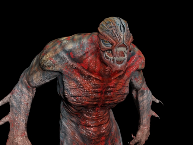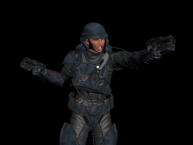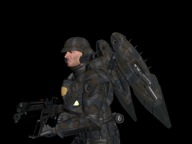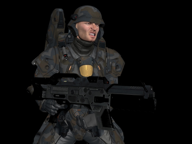 Un avance más. Como lo comente, los soldados tienen algunas piezas de modelos de Daz, no son modelados 100% por mí, pues no modelo bien personajes. El escenario es mío inspirado en Starship Troopers, pero los materiales si los he preparado yo. Aquí el escenario y uno de los enemigos.