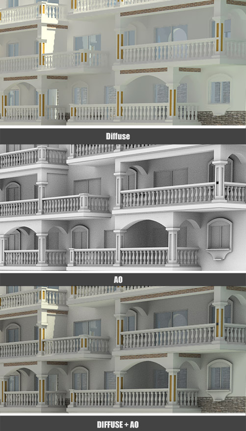Una vez renderizada la oclusión como una capa aparte nos vamos a Adobe Photoshop y montamos los dos render usando un modo de fusión multiplicar en Adobe Photoshop (por ejemplo, dependiendo del efecto que se busque).