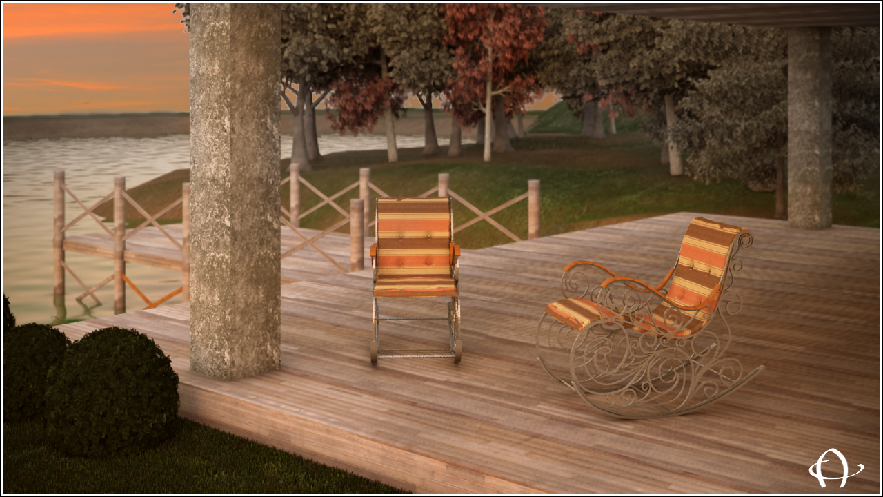 Hola a todos/as, que me he picado con los exteriores esta claro, esta vez presento una vista de un porche mientras cae el sol.