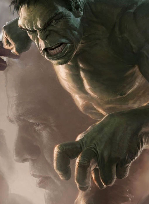 Kf: hell be about the same size he was in the incredible Hulk [which was about 9 fet tall] or maybe a Little bit smaller. His muscles wont be quite as Cut. We figure hes ben the Hulk now for a few years and [his Physique is changing]. Hes not as Cut or as ripped as he was in the incredible Hulk. the most important thing is that face. As you can already se in that concept painting, it is -- more than any Hulk thats ever ben done in live action -- a Hulk that lets you se the actor in there. You Will be able todo se rufalo in there. That was a big revelation for us. Its just a concept painting, but in that you can se the [influence of Marvel cómics Pionner and original Hulk artista Jack] Kirby, as people have already pointed out, but also, and equally important in this case, rufalos eyes and his cheque structure. It is him.