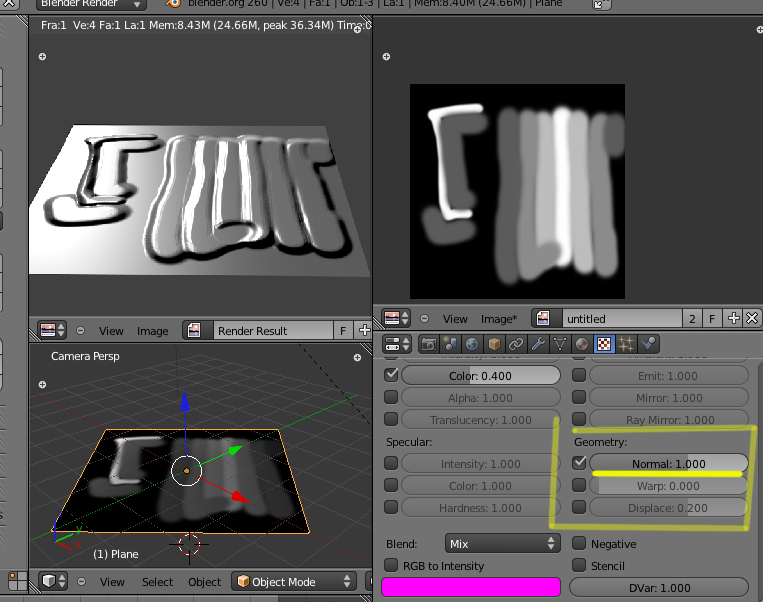 En la parte de textura > geometry tienes las opciones de normal y displace. Un ejemplo, subo una imagen. Es una textura de imagen con varios tonos de grises. Al marcar normal, en el render que hagas (con su correspondiente iluminación) se verá el relieve de esos diferentes tonos de blanco a gris.